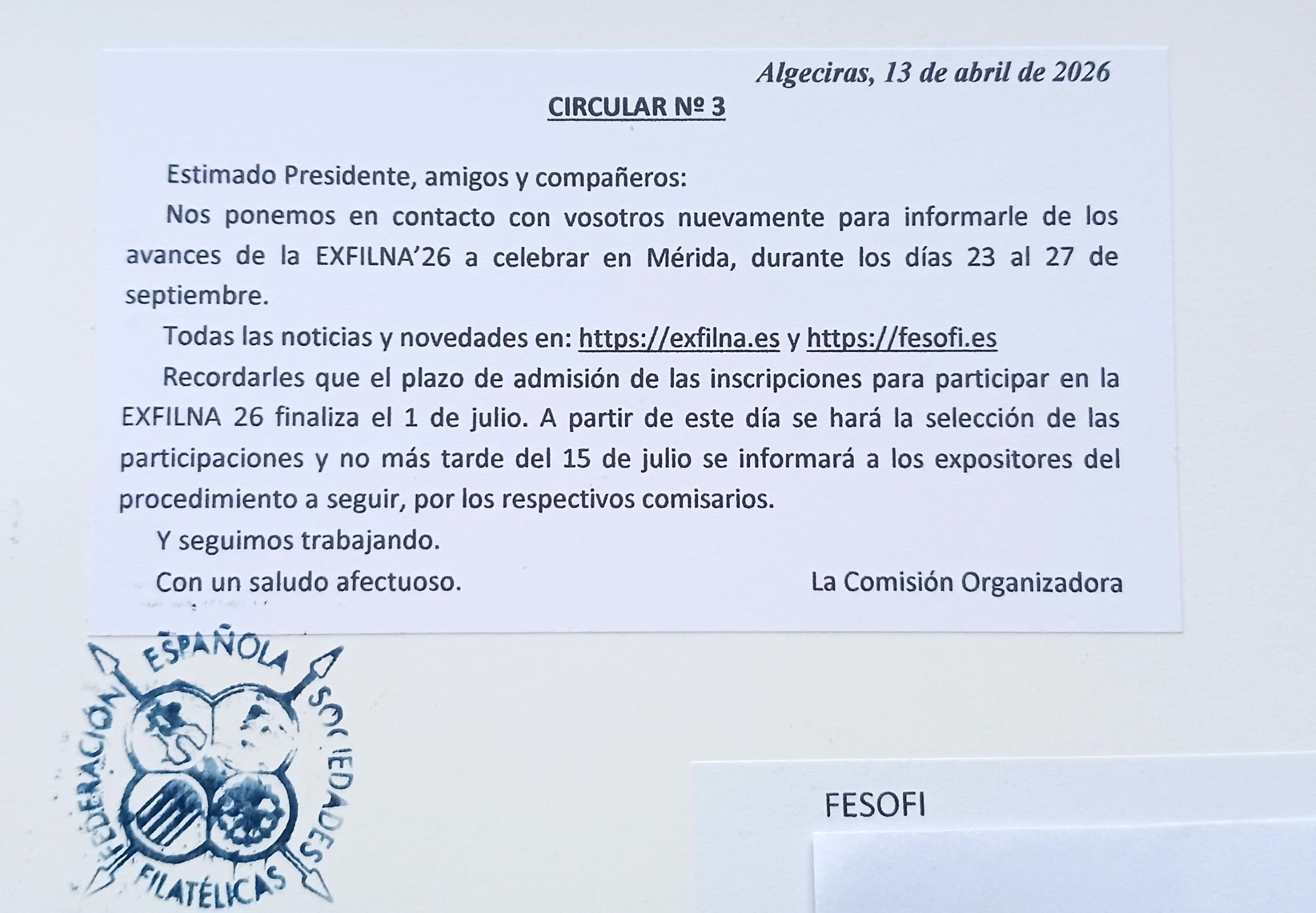 desde FESOFI se ha hecho llegar a la JD de Afinet una circular informativa sobre la Exfilna 2026 que procedemos a comunicar aquí para todos los foreros que estuviesen interesados en presentar colecciones a la misma. Sirva de complemento a lo informado hasta ahora en este hilo.