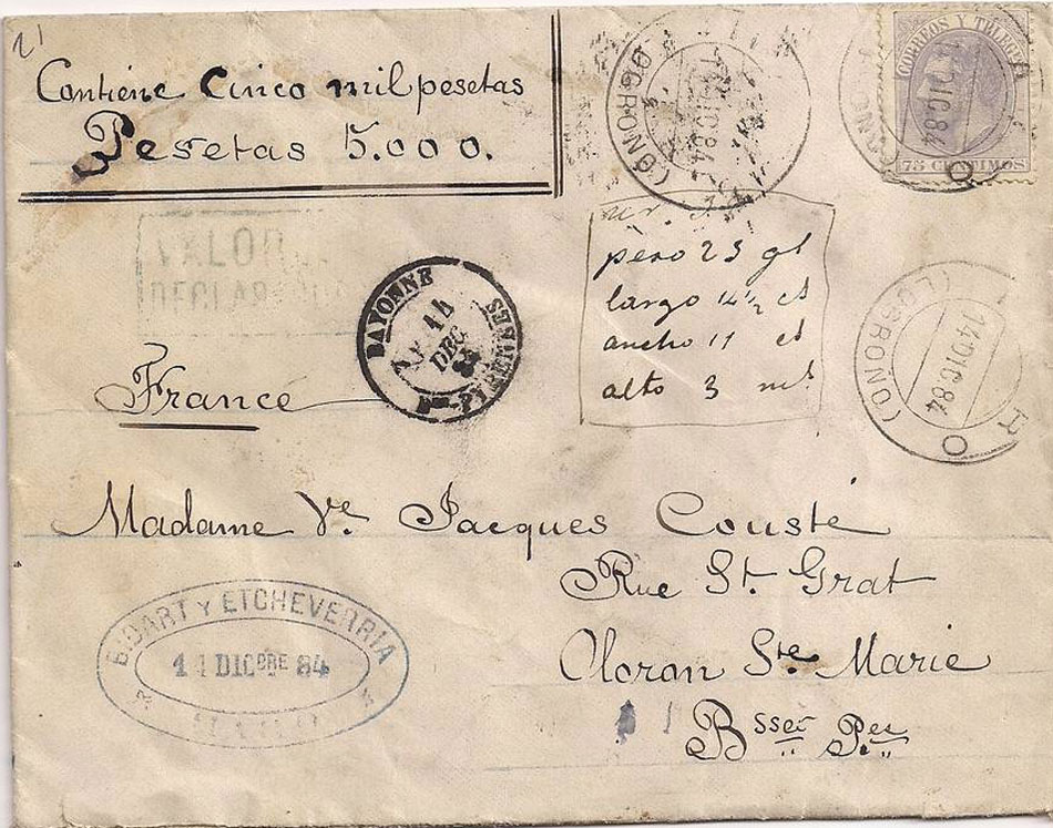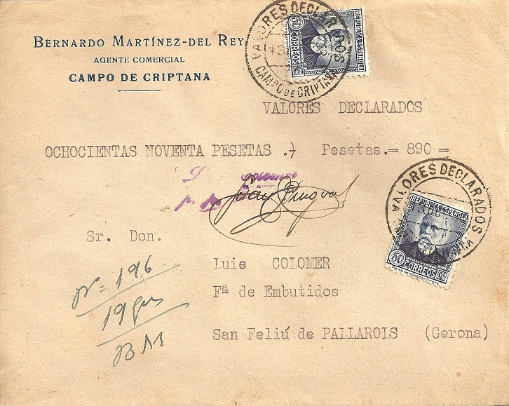 Me parece sumamente interesante y bien documentado este hilo. Por suerte he encontrado algunas imágenes de cartas de Valores Declarados y voy a ir mostrandolas. El valor declarado en esta carta es de 900 pesetas y se dirige desde el Tánger españól a París. Aparece franqueado con sellos de Alfonso XIII con sobrecarga de Marruecos. Los faciales, aunque los sellos no se ven muy nítidos, los describía la casa subastadora, y son de 5,15,40,50 céntimos, 1 peseta y 4 pesetas (2 sellos). En total sumo 10,10 pesetas.