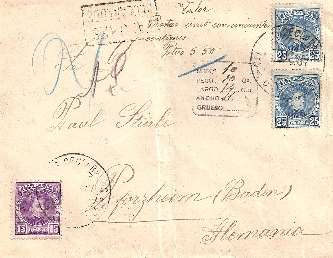 Tarifa de 75cts correcta para Francia (50cts de doble porte por el peso y otros 25cts de certificado).El resto de los sellos,lo que es el impote del VD,se ponían aparte en un impreso y se taladraban adjuntándolos al resguardo del certificado.
