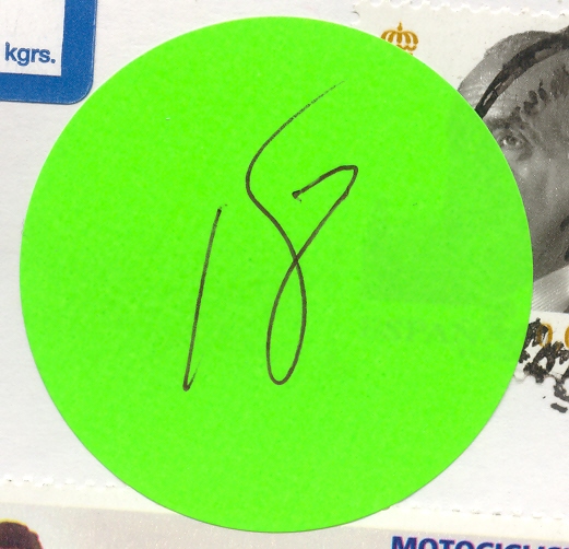 - Etiqueta redonda verde (4 cm., de diámetro) con el número 18 escrito a bolígrafo.