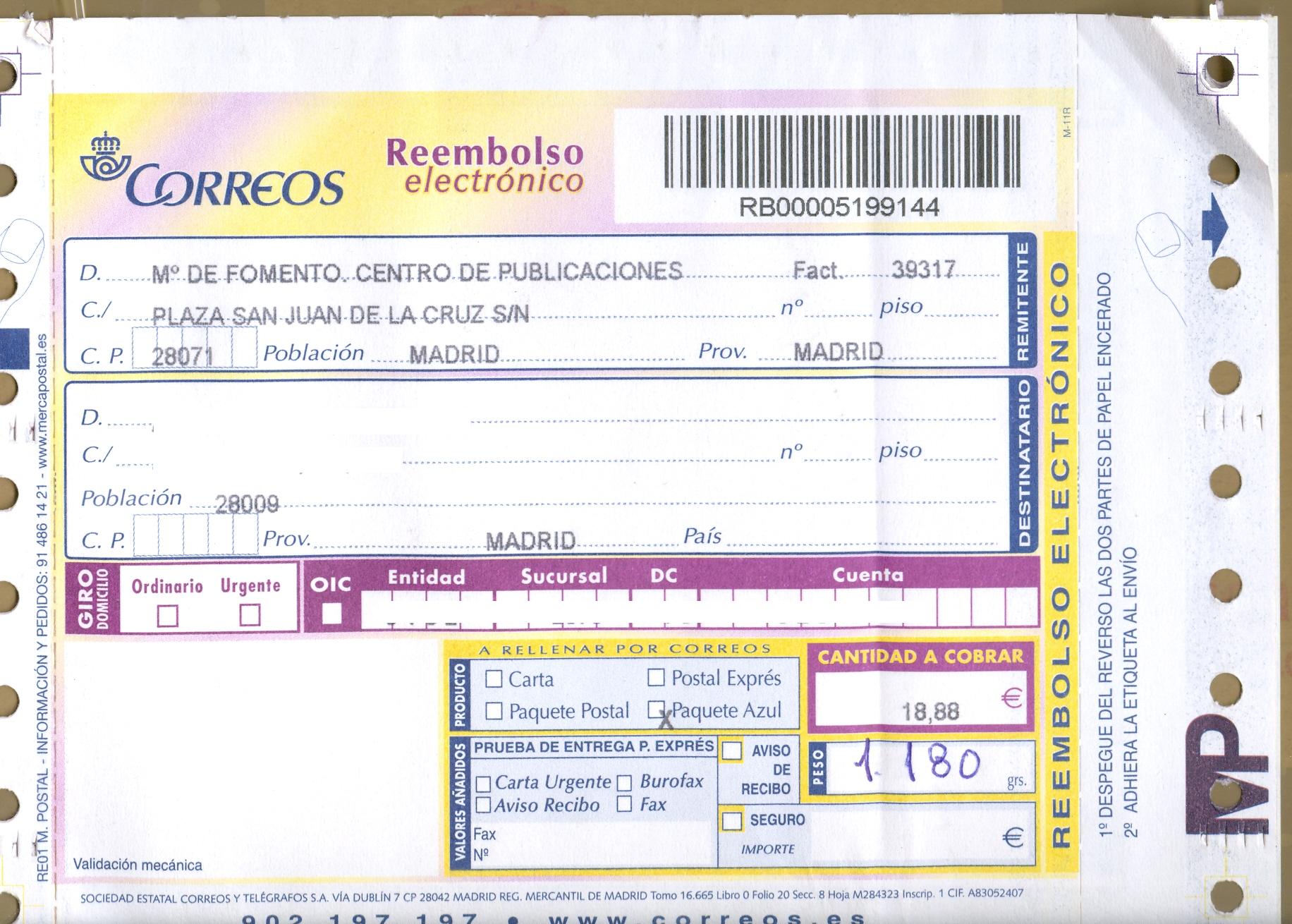 También reproduzco el impreso del Reembolso electrónico que el propio remitente ha adherido al envío (por eso no lleva validación mecánica) para que se compruebe que el número de referencia es el mismo en ambos casos.