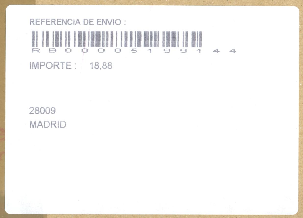 En la etiqueta blanca, debajo de la indicación REFERENCIA DE ENVIO: se imprime un código de barrar, el código de referencia del envío (en este caso un reembolso), el importe del mismo y la dirección del destinatario.