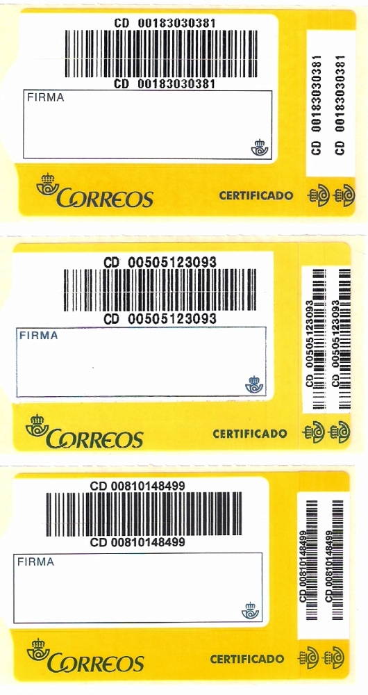 Certificado ordinario nacional: El primero, sin código de barras lateral, utilizado entre 2000 y 2004; de los otros dos, ya con código de barras lateral, el de enmedio en uso desde 2004 hasta 2009; el de debajo es el modelo más moderno (2009-2012). El que muestra Setobo como más nuevo es el que acaban de enviar a las oficinas en Noviembre. Por lo tanto estos dos más modernos son coetáneos. Certificado Urgente nacional: El primero, anterior a 2002, tiene 10 cifras, el segundo, posterior llegando hasta 2012, tiene 11 cifras, y el actual, ya con código de barras, el último en uso, es el de abajo. Certificado (Valores Declarados) nacional, según me consta: