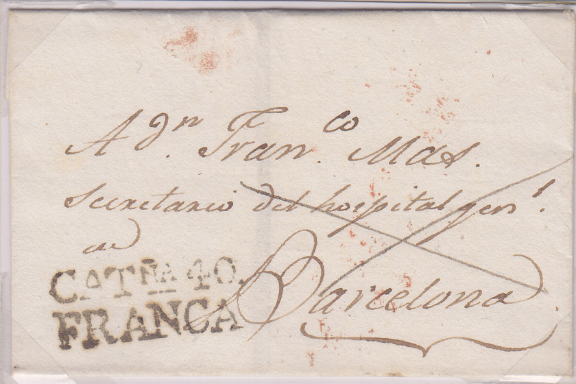 Marca de Franqueo, inédita y desconocida hasta la fecha, de Torredembarra. Cuño CATÑA 40 / FRANCA. en carta circulada en 1831 de Torredembarra a Barcelona