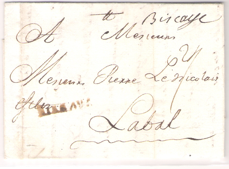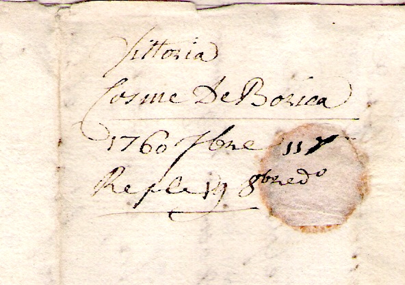 Pues como al amigo Pepe parece que "le va la marcha", pongo una marca de Vitoria que el Tizón que yo tengo (el de los 3 tomos) cataloga entre 1758 y 1759, y la carta que pongo es de septiembre de 1760 ( en tinta de escribir). Se trata de BIZCAYA en tinta negra. Lleva además un "Bizcaye" francés manuscrito, como curiosidad.