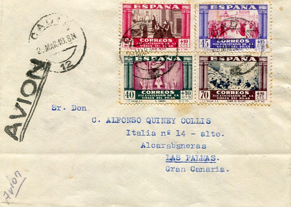 Correspondencia de Cádiz a Las Palmas (29/03/1940) con franqueo muy filatélico (una pena), pero con una marca AVION que no tenía catalogada. Su interés radica (para mí) en la doble barra que subraya la indicación avión.