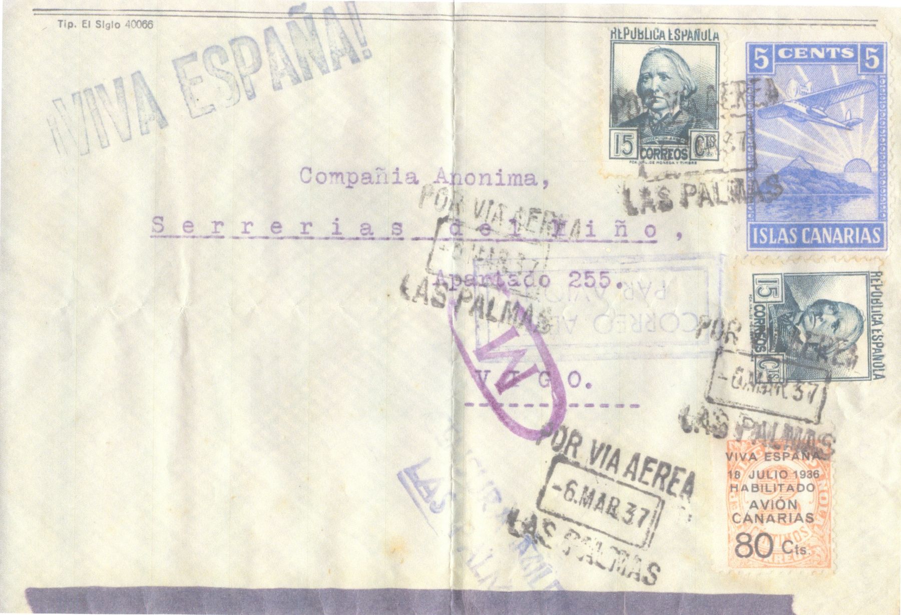 Por cierto, al margen de lo anterior se puede observar que la carta circula con dos sellos de 15 céntimos de Concepción Arenal de la República Española (según la tarifa del 04/05/1932, hasta 25 gramos), con un sello habilitado para 80 céntimos de correspondencia aérea, según la tarifa, hasta 25 gramos, de sobreportes aéreos que estuvo en vigor del 03/10/1936 al 04/05/1938 y con una viñeta de 5 céntimos para dar más color.