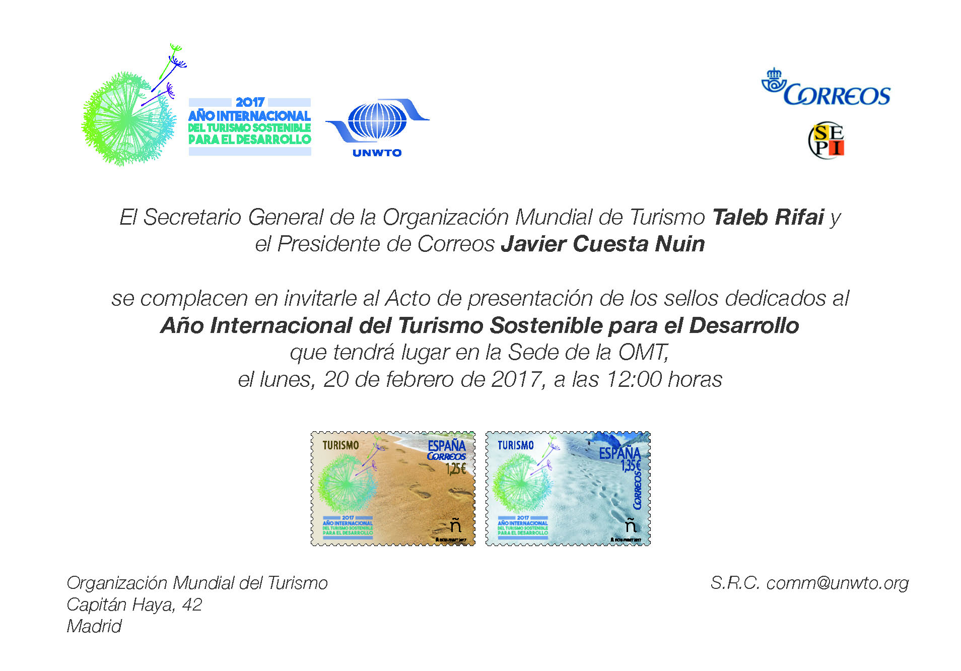 Reproduzco la invitación que, en este sentido, han cursado el Secretario Genral de la Organización Mundial de Turismo, Taleb Rifai; y el Presidente de Correos, Javier Cuesta Nuin.