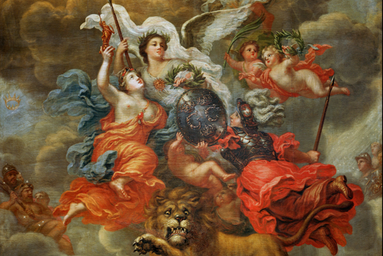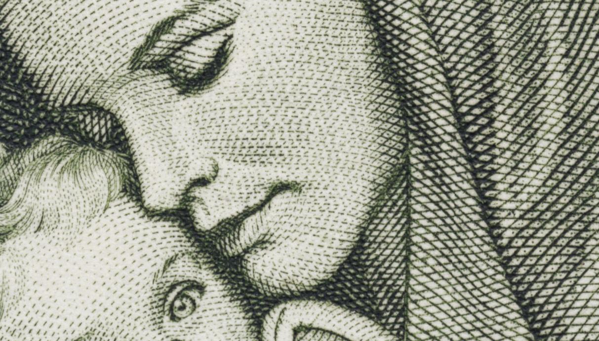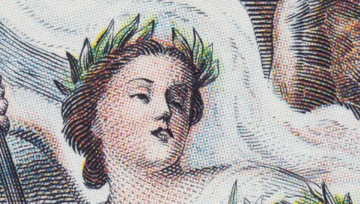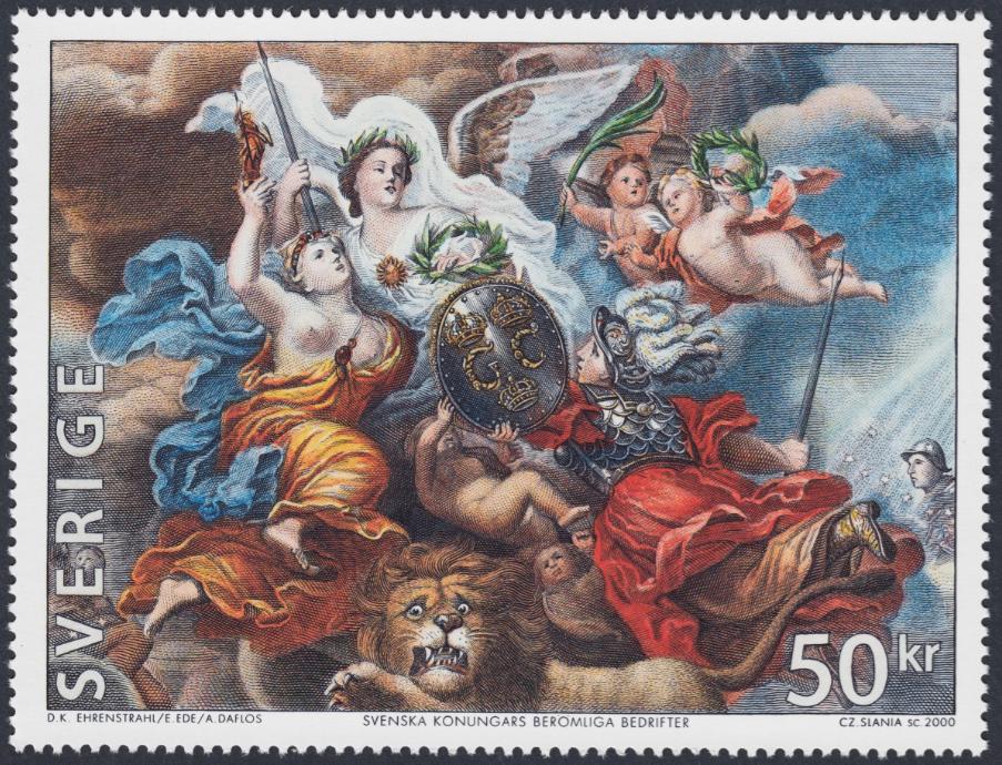 Cuando se imprimió en el año 2000 se dijo que este era el sello calcográfico más grande del mundo. Grabado de Czeslaw Slania para celebrar su grabado número mil para un sello postal. Fragmento del fresco del pintor sueco David Klöcker Ehrenstrahl (1629-1698).