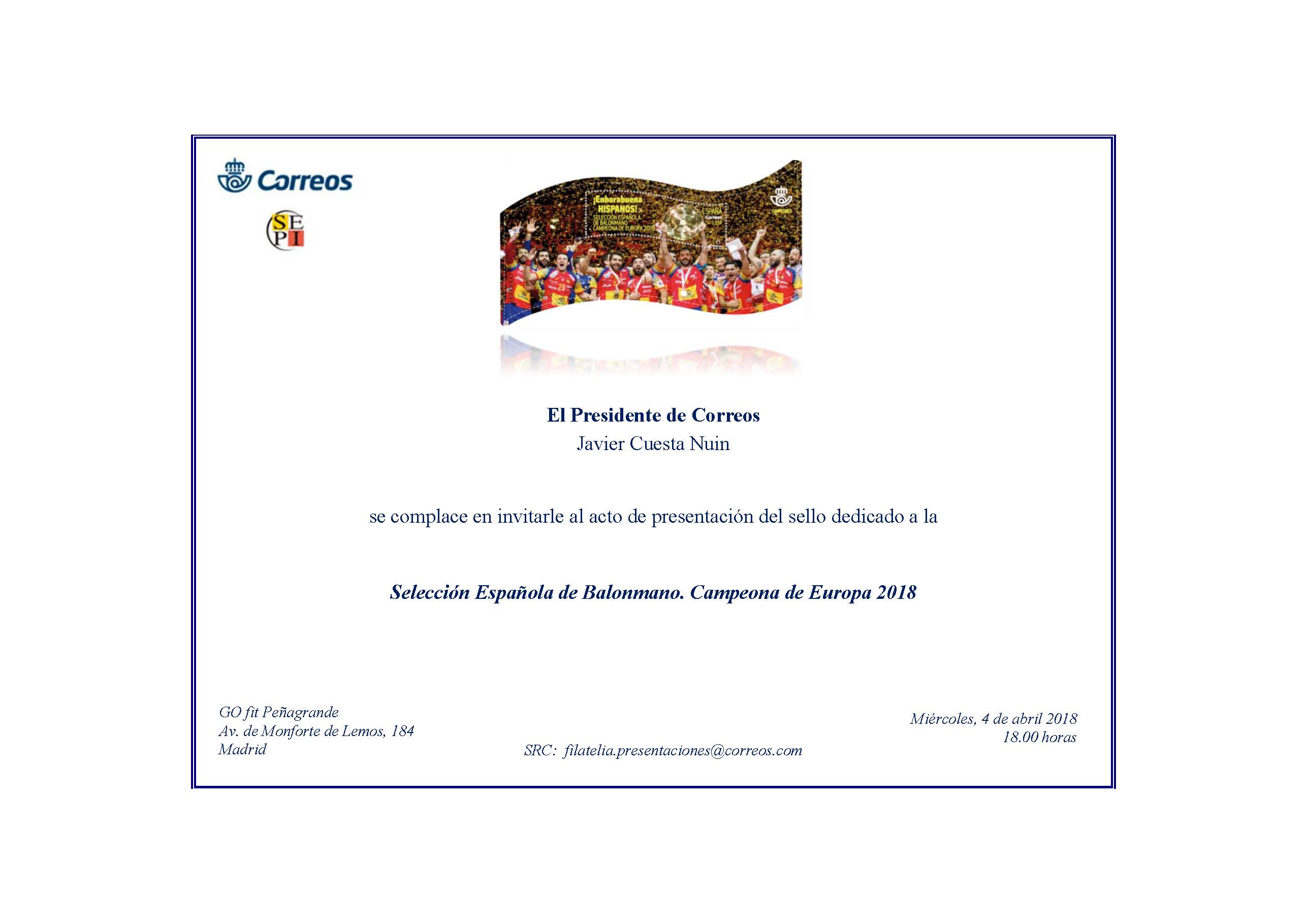 Para los que quieran y puedan asistir, comunico que el próximo 4 de abril, miércoles, está previsto que se presente la emisión del sello dedicado a la "Selección Española de Balonmano. Campeona de Europa 2018" emitido el pasado 23 de marzo.