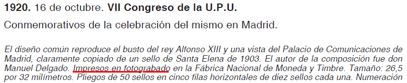 Como se puede comprobar Sánchez Toda andaba despistado con lo de que no se aprecian las diferencias. Las diferencias apuntadas también se aprecian en las imágenes de los sellos que subiste, el sello de 1920 tiene una impresión grosera típica del fotograbado. A todo lo dicho hay que precisar que se puede mejorar el acabado de los dos ejemplos que hemos visto de fotograbado, eso sí, son procesos tan complicados que son inviables comercialmente.