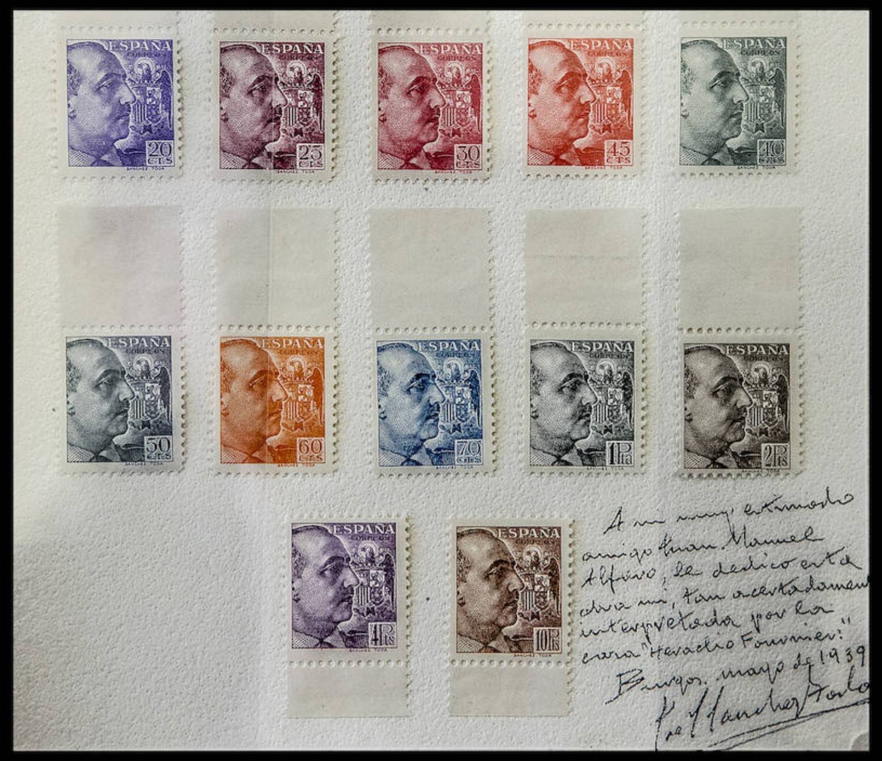 De lo que dices de si Sánchez Toda pudo equivocarse en los datos que ofrece del Franco de Vitoria, yo lo veo muy poco probable. Páginas atrás ya puse la dedicatoria de Sánchez Toda de mayo del 39, que ahora recupero, y es evidente que el grabador tenía la mejor consideración de estos sellos, por su diseño, grabado e impresión, y necesariamente hubo de enterarse muy bien sobre cómo fueron confeccionados.