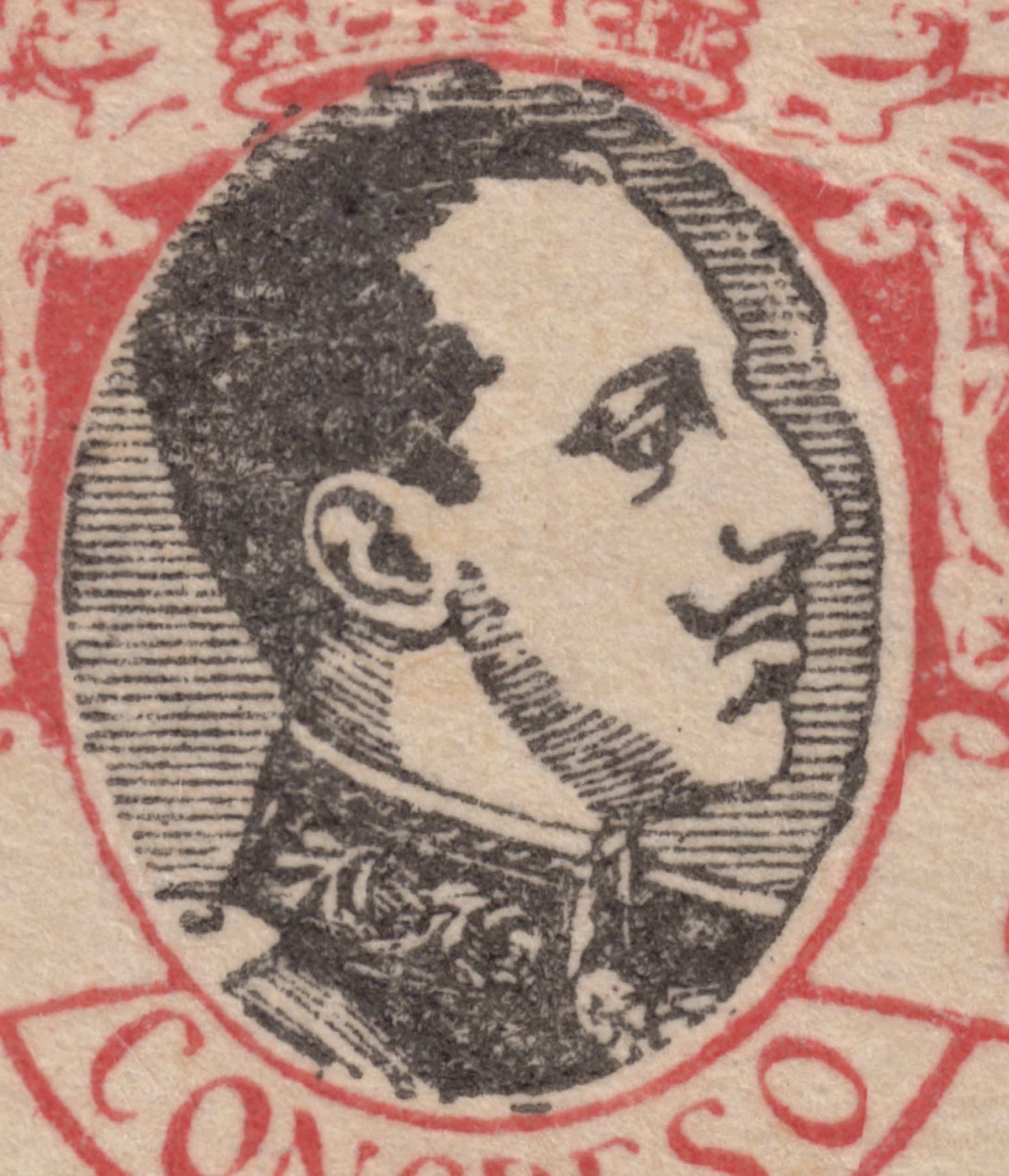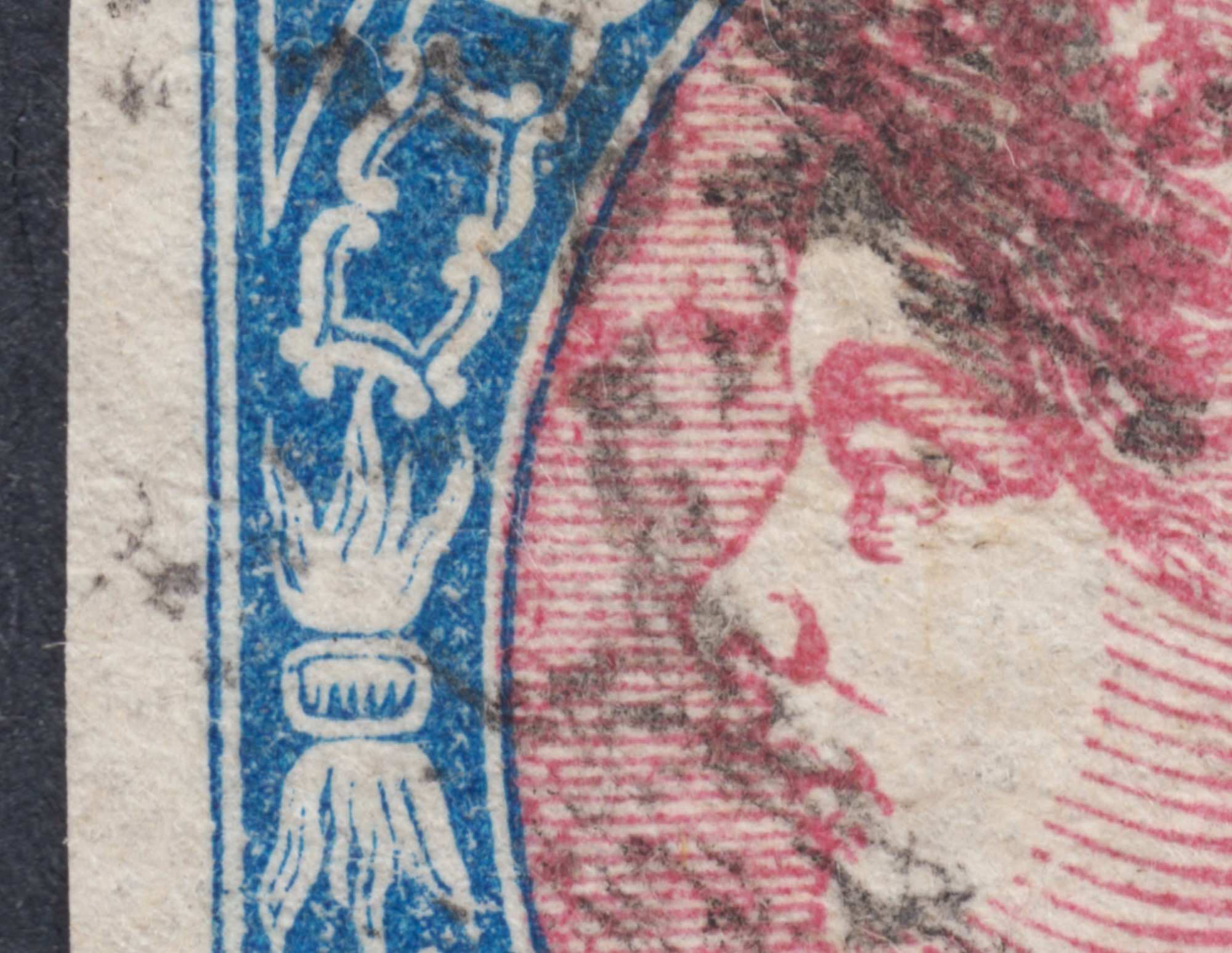 Primera imagen la del sello autentico, la segunda la de uno falso. Cuando se comparan ambas imágenes se aprecian las diferencias. La imagen del sello auténtico pertenece a un ejemplar normal de la emisión, trazos finos y definidos. En el falso tipográfico (impresión grosera) se comprueba la excesiva presión en el marco, trazos muy gruesos en general, deformación de algún elemento y la falta de definición de los trazos del adorno inferior derecho. A todo lo dicho hay que precisar que los falsos tipográficos se reprodujeron por moldeo y no por galvanoplastia, lo que hace que difieran ligeramente unos de otros.
