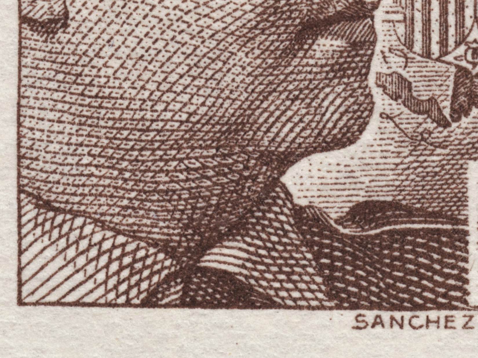 Para mí Sánchez Toda, aun no escribiendo tan bien como grababa ni de lejos, sí que es preciso y extenso en el libro, sellos franceses aparte. Y referente al fotograbado, se extiende más detalladamente en otras páginas. Te pongo imágenes gigantes de ese sello que afirmas que fue impreso en fotograbado e intercalo fragmento de otro sello impreso en tipografía para comparar. ¿Seguro que fue impreso así? Sólo pregunto.