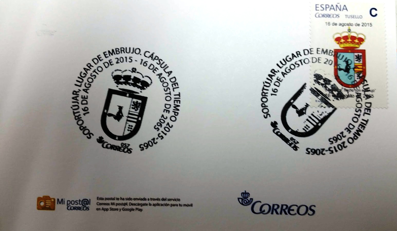 [hr]Madrid, 14 de agosto de 2015.- El pasado domingo, 16 de agosto, se selló en el alpujarreño pueblo de Soportújar una Cápsula del Tiempo que guardará durante medio siglo las leyendas e historias de sus vecinos. Esta original iniciativa, pensada para reforzar el atractivo turístico de la localidad, ha contado con la colaboración de CORREOS que ha emitido un matasellos especial 2015-2065, ha editado 1.000 tarjetas postales con la imagen de la emblemática “Fuente de las Brujas” de Soportújar, así como una tirada especial de “TUSELLO” con 50 sellos personalizados con el escudo de la población.