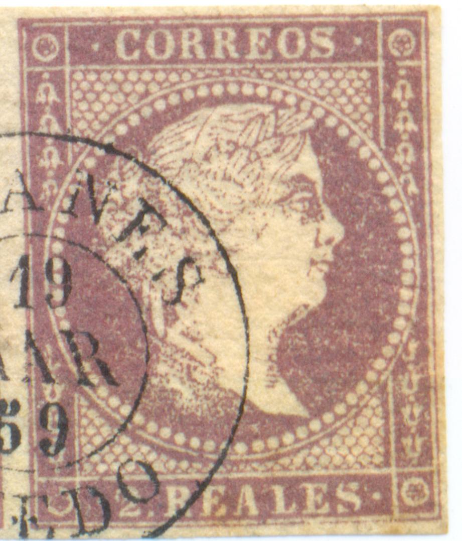 Toy con Jaume: este fechador de Sevilla estampado integro en 1874 es más raro que los peces de colores. Observa la "prima hermana" y verás que afecta la mismísima zona sin impresión. Además, en el aumento de imagen me parece apreciar el número del día sobre el sello de la izquierda.