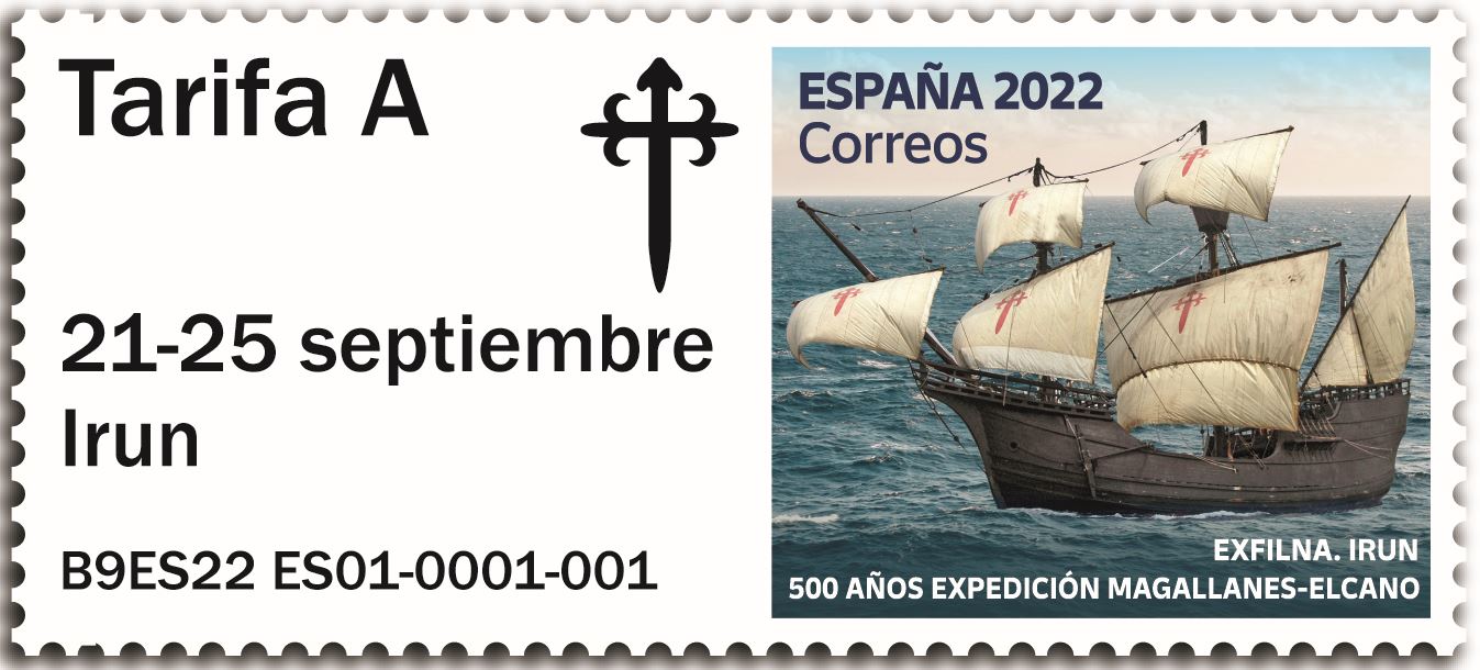 EXFILNA IRUN. 500 AÑOS EXPEDICIÓN MAGALLANES-ELCANO: Se reproduce la réplica del navío que entre 1519 y 1522 realizó la Primera Vuelta al Mundo, la Nao Victoria. La construcción se hizo partiendo de troncos de Iroko con unas dimensiones de una eslora de 26 metros, una manga de 6,6 metros, un calado de 3 metros y 3 palos, además del bauprés, que enarbolan 6 velas con una superficie de 290 metros cuadrados. Por primera vez en la historia un barco, que sale y regresa del puerto de Sevilla capitaneado por Juan Sebastián Elcano, consiguió rodear el planeta.