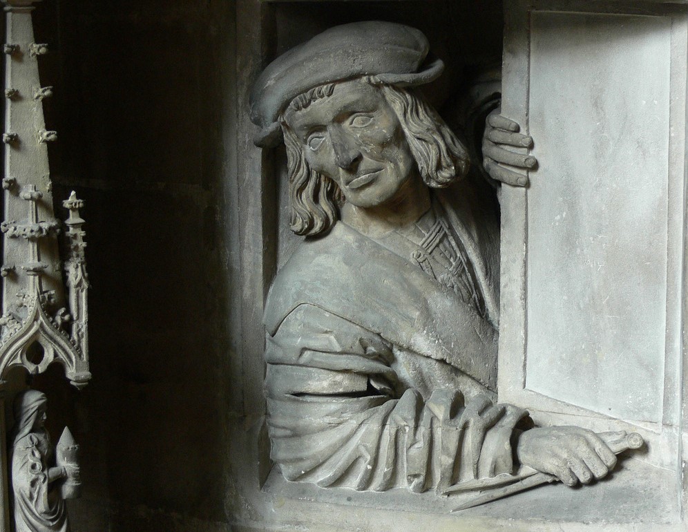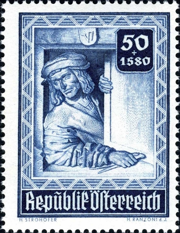 Por debajo de estas líneas, exponemos el grabado de Mórck de la curiosa estatua de Anton Pilgram, en la Catedral de San Esteban de Viena. De este relieve extraño y bello, en realidad un autorretrato delicioso en piedra del propio escultor y conocido como El mirón, ya expusimos hace muchas páginas el sello de Austria de 1946 (*), con grabado nada menos que de Hans Ranzoni, otro grande del buril. Lo recuperamos, porque la ocasión bien lo merece, junto con una imagen de la escultura original.