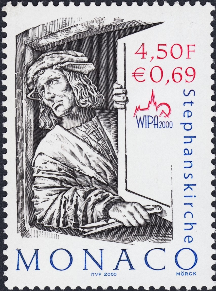 Mórck, por su parte, diseñador también de este sello emitido por Mónaco en el año 2000, escora la perspectiva para descuadrar con elegancia la rotulación publicitadora de la WIPA, pero también para dar un protagonismo tan modesto como intencionado al compás que sujeta Pilgram.
