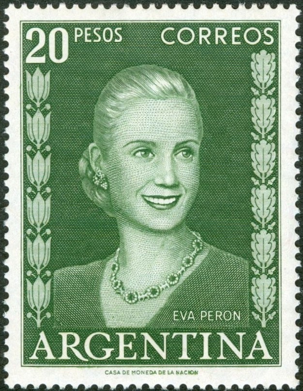 Como última imagen de esta entrada, añadimos, a modo complementario y aunque no pertenece a esta serie, otro de los sellos más emblemáticos de Pietro Nicastro: el bello retrato que grabó de una sonriente y pletórica Eva Perón, emitido por Argentina en dos valores calcográficos en 1952, pocas fechas después de la muerte de esta mujer hoy más que mítica.