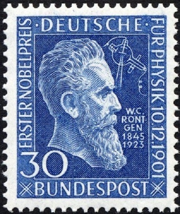 Aunque muchas veces filatelizado, y sin ir más lejos en un buen sello español de 1967 (huecograbado), del descubridor de los rayos x tal vez el sello más emblemático sea el que adjuntamos de Alemania de 1951. Sello, de tamaño pequeño y gran altura artística, cincelado por el polaco Jan Piwczyk, uno de los mejores grabadores centroeuropeos de la época y a quien ya presentamos, con todos los honores que su talento merece, hace muchas páginas (*).