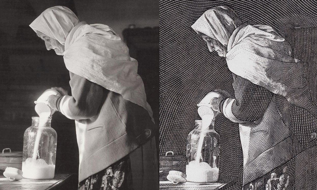 Especialmente impactante y genial es, no el tarro de leche, que también lo es y que domina estéticamente la composición con su transparencia y su blancor prístino, sino sobre todo el perfil de la anciana mujer, lo poco que dejar ver el pañuelo que lleva anudado. Como podemos observar, en la fotografía de Martin Martinček ese perfil es suave y carnoso, en tanto que Cigánik lo incide en el acero de un modo vehemente y sin contemplaciones, creando y exponiendo, a través de una sencilla y en realidad intuitiva y genial caligrafía, una crudeza rotunda y estremecedora.