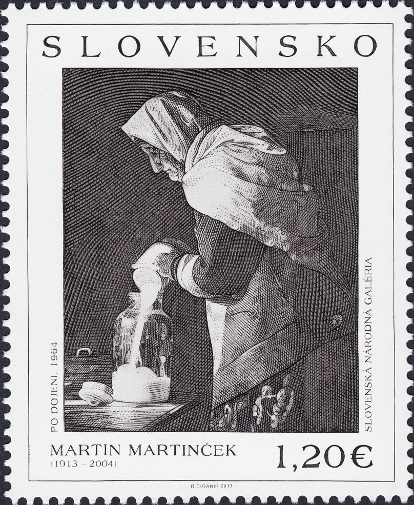 Hace pocas páginas, en la presentación formal del grabador eslovaco Rudolf Cigánik, expusimos este sello emitido por Eslovaquia en 2013 de la anciana echando leche en un tarro de cristal. Nos pareció entonces un sello impresionante, a pesar de no tenerlo y de suficiente que estimábamos la imagen oficial del mismo para escribir ese juicio inapelable. Pero ahora lo hemos recibido y, tras hacerle un escáner a gran resolución, el sello es aún más imponente de lo que un principio sentenciamos. ¡Qué maravilla de sello!