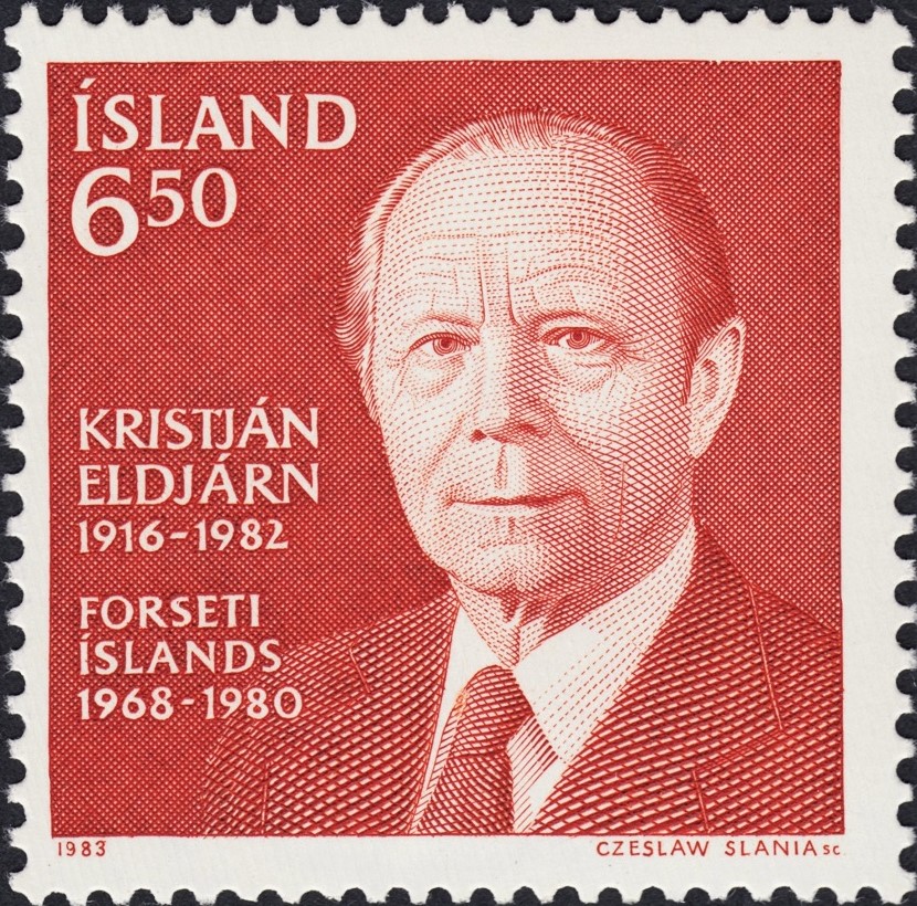 A pesar de las diferencias en la texturas de la corbata y de la chaqueta, elementos por lo demás muy testimoniales en este grabado flemático de Slania, parece razonable aceptar que el gran maestro polaco talla al Presidente islandés Kristján Eldjarn (1968-1980) a partir de la fotografía que adjuntamos. El pliegue del cuello delata la fuente.