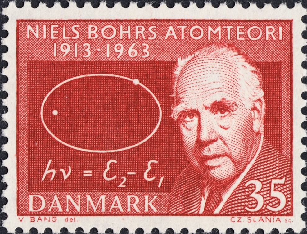 Un diamante más de Slania. Sello emitido por Dinamarca en 1963, pequeño de tamaño e impreso en dos valores, en honor de uno de los físicos más eminentes de la historia, entonces recientemente fallecido: Niels Bohr (1885-1962). Diseño perspicaz y eficazmente simbólico de Viggo Bang.