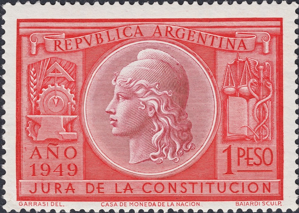 Sellos ambos de 1949, diseñados y dibujados por Renato Garrasi, y grabados con una pulcritud elegante y exquisita por Mario Baiardi. El sello dedicado a la Constitución fue emitido en junio de 1949, mientras que el que conmemora el 75 aniversario de la UPU lo emitió Argentina a finales de ese mismo año. Se inspira Garrasi para el diseño de ambos sellos en figuras alegóricas de la libertad y la paz, por lo demás muy presentes en billetes y monedas argentinas, a partir de las bellas intuiciones primero y sobre todo, en los tiempos modernos en cuanto al perfil de aquélla, del artista francés Eugène-André Oudiné, y después de Lucien Georges Bazor, de la misma nacionalidad.