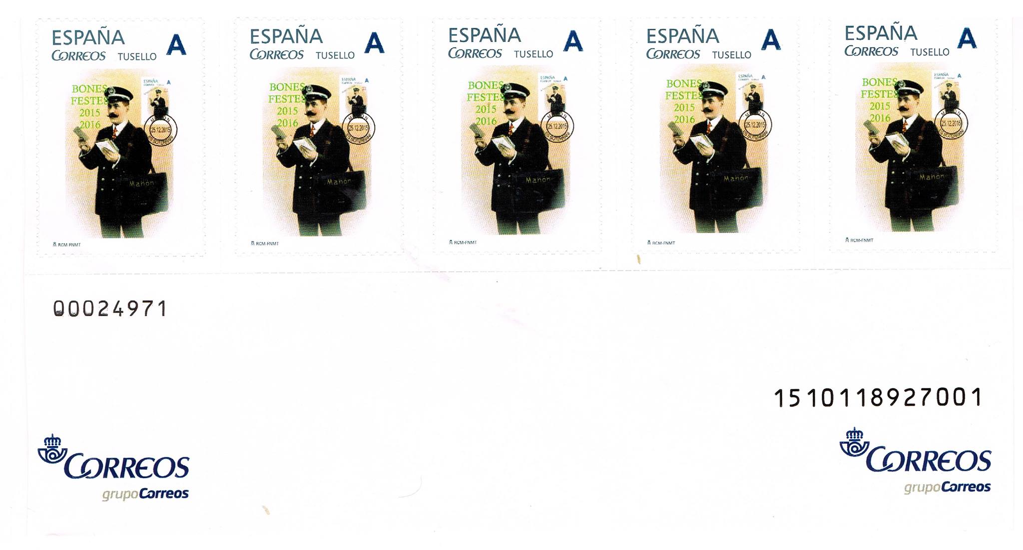 Reproduzco en este mensaje el sello personalizado (TU SELLO) emitido en Valencia, este mes, por parte de la Sociedad Valenciana de Filatelistas para desear "Bon Nadal i un feliç Nou Any 2016!".