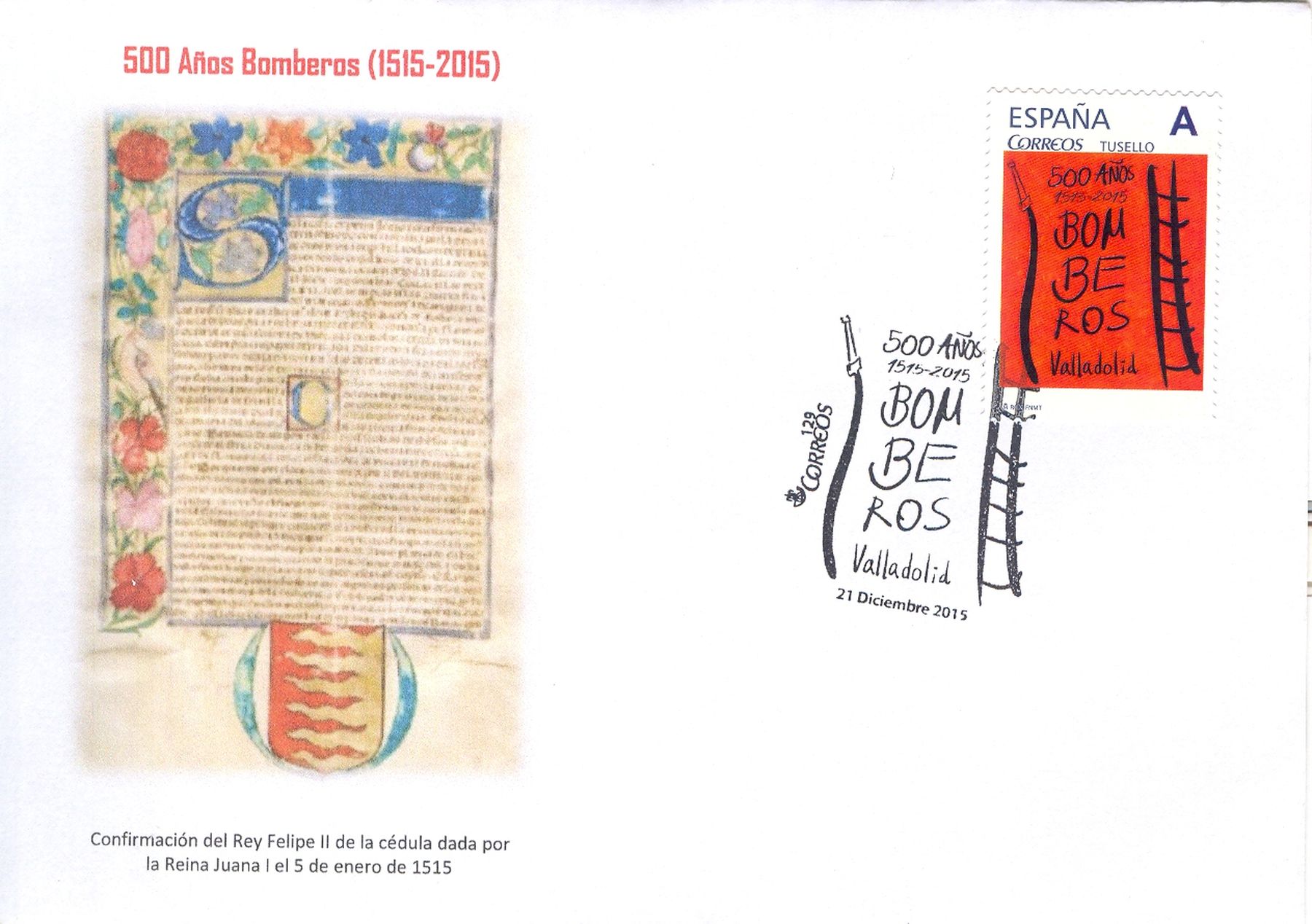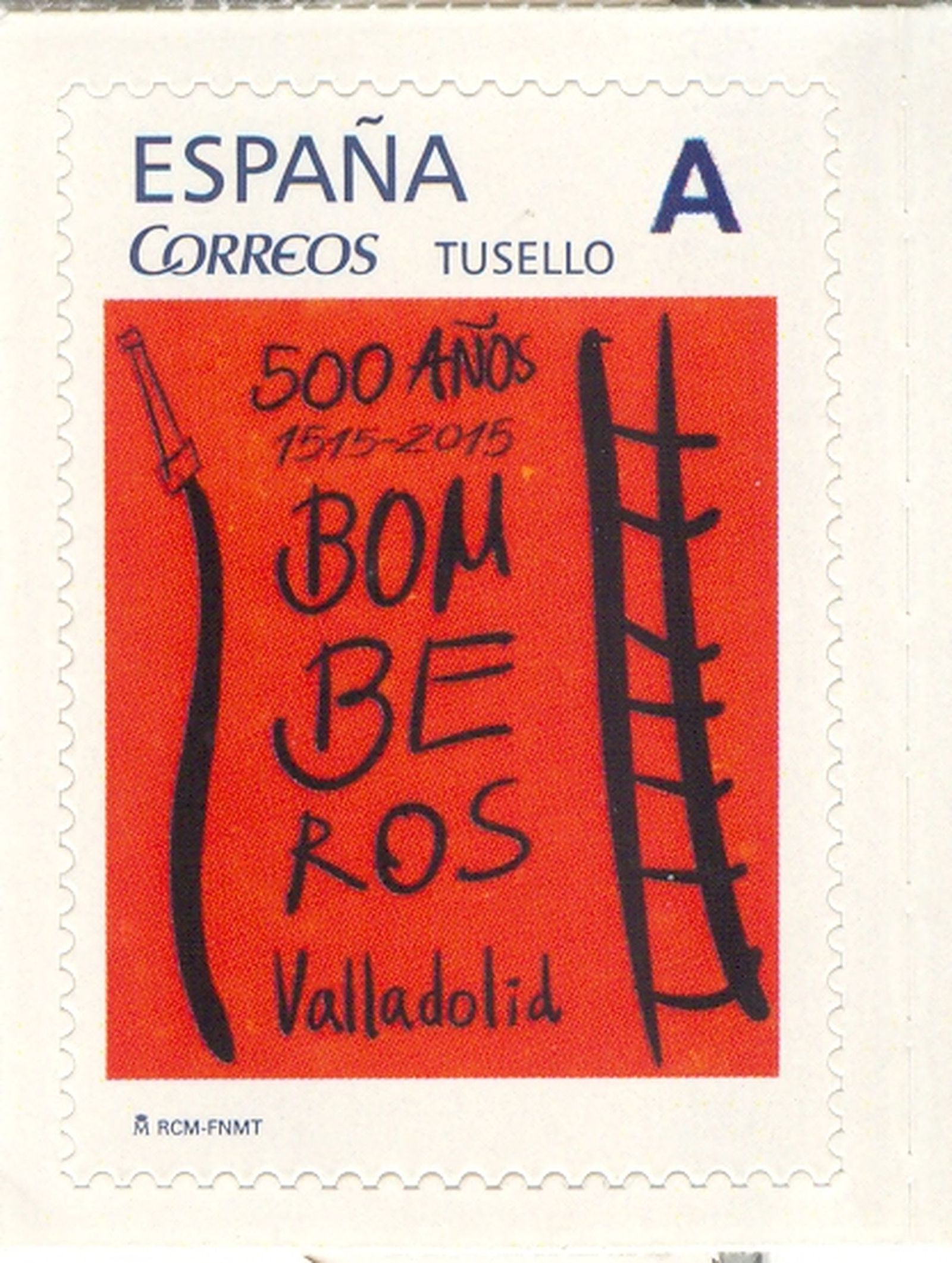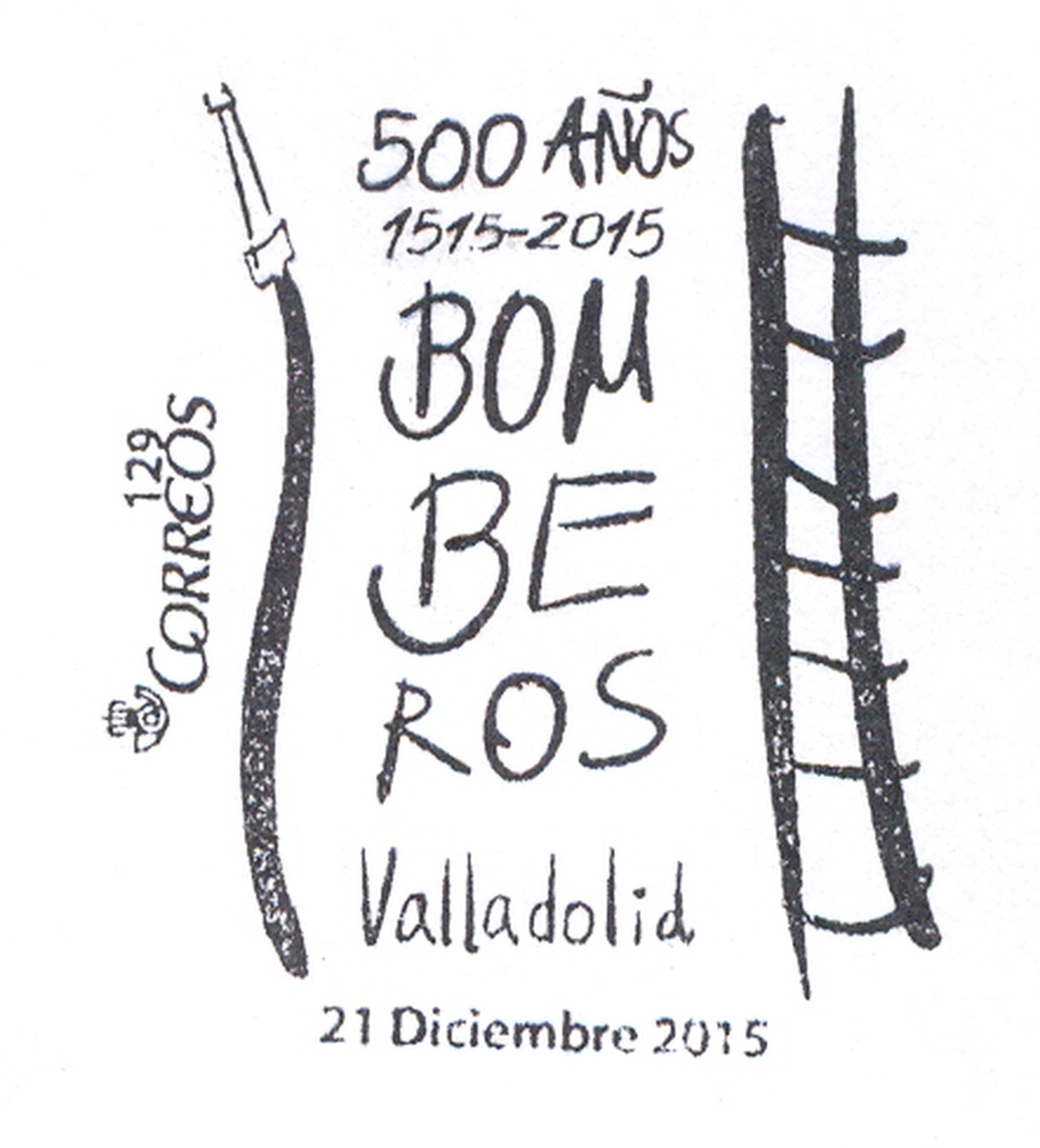Reproduzco en este mensaje el sello personalizado (TU SELLO) emitido en Valladolid el pasado 21 de diciembre con ocasión de la celebración, en el Museo de la Ciencia, de la Exposición "500 Años Bomberos (1515-2015).