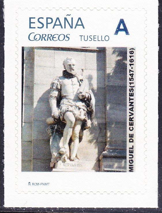Ya se comienzan a preparar emisiones en conmemoración de los 400 Años de la muerte de Miguel de Cervantes en este año que entramos del 2016, y me han validado en Correos un Tu Sello, reproduciendo la estátuda del mismo, existente en la Biblioteca Nacional de Madrid. Obra del ingigne escultor catalán Joán Vancell (1864-1944), alumno de Jerónim Suñol.