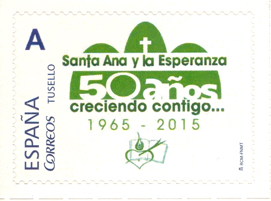Reproduzco en este mensaje el sello personalizado (TU SELLO) emitido en el año 2015 por la Parroquia de Santa Ana y la Esperanza de Madrid (Moratalaz) para conmemorar sus primeros 50 años de existencia.