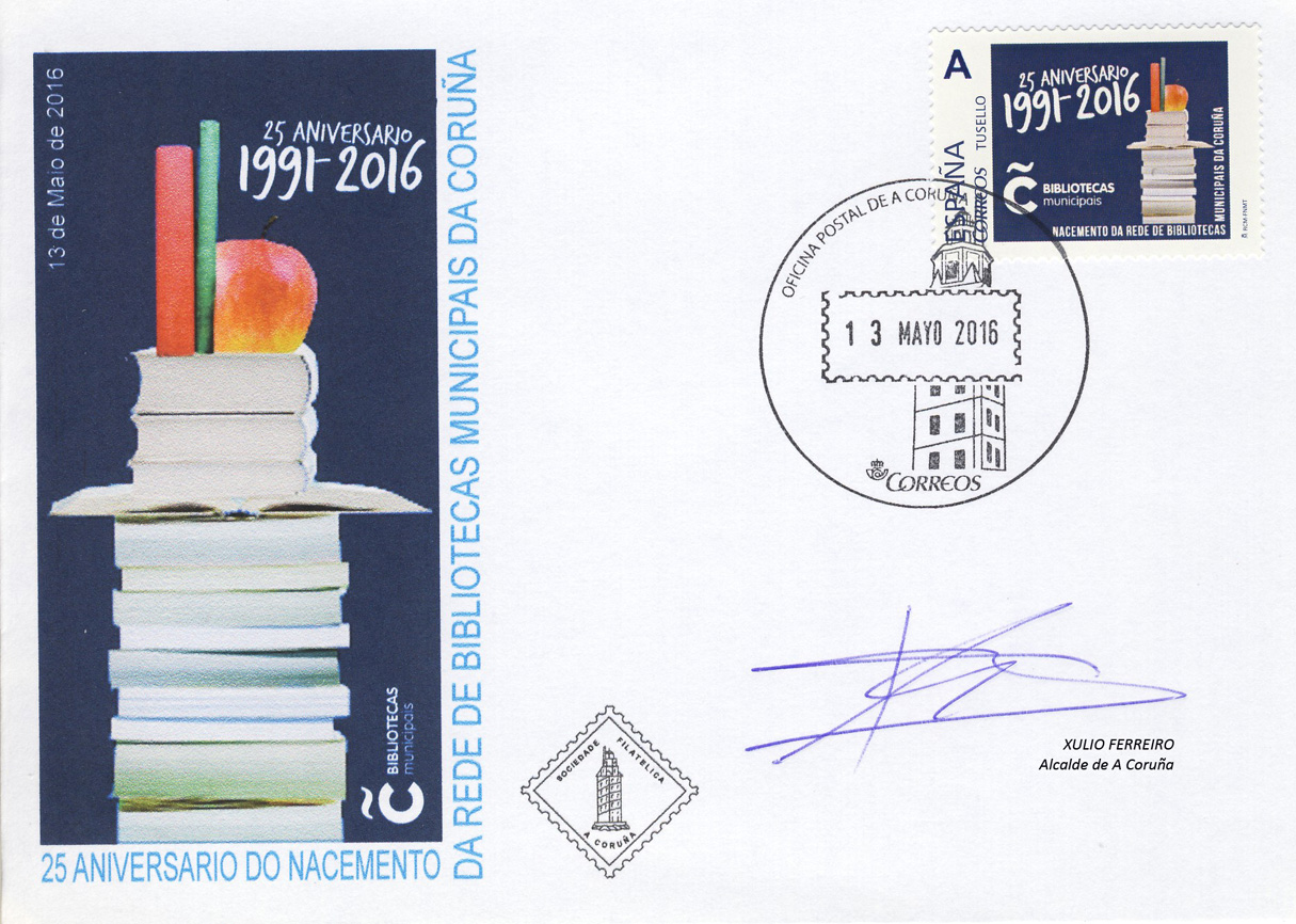Con motivo de la celebración del 25 aniversario de la creación de la Red de Bibliotecas Municipales de A Coruña, el Ayuntamiento en colaboración del la Sociedad Filatélica de A Coruña, el día 13 de Mayo ha puesto en circulación un sellos personalizado.