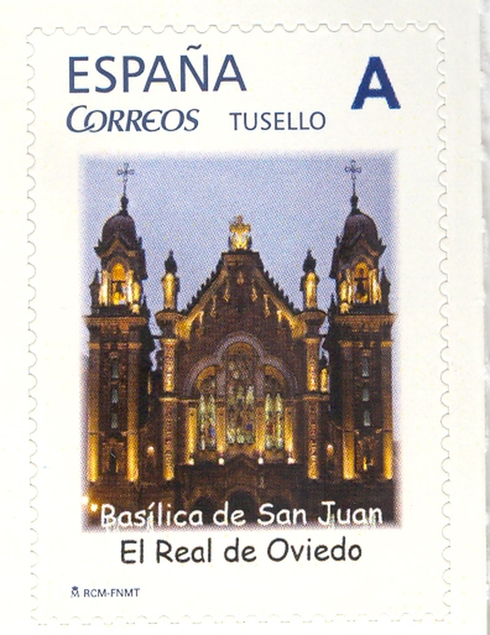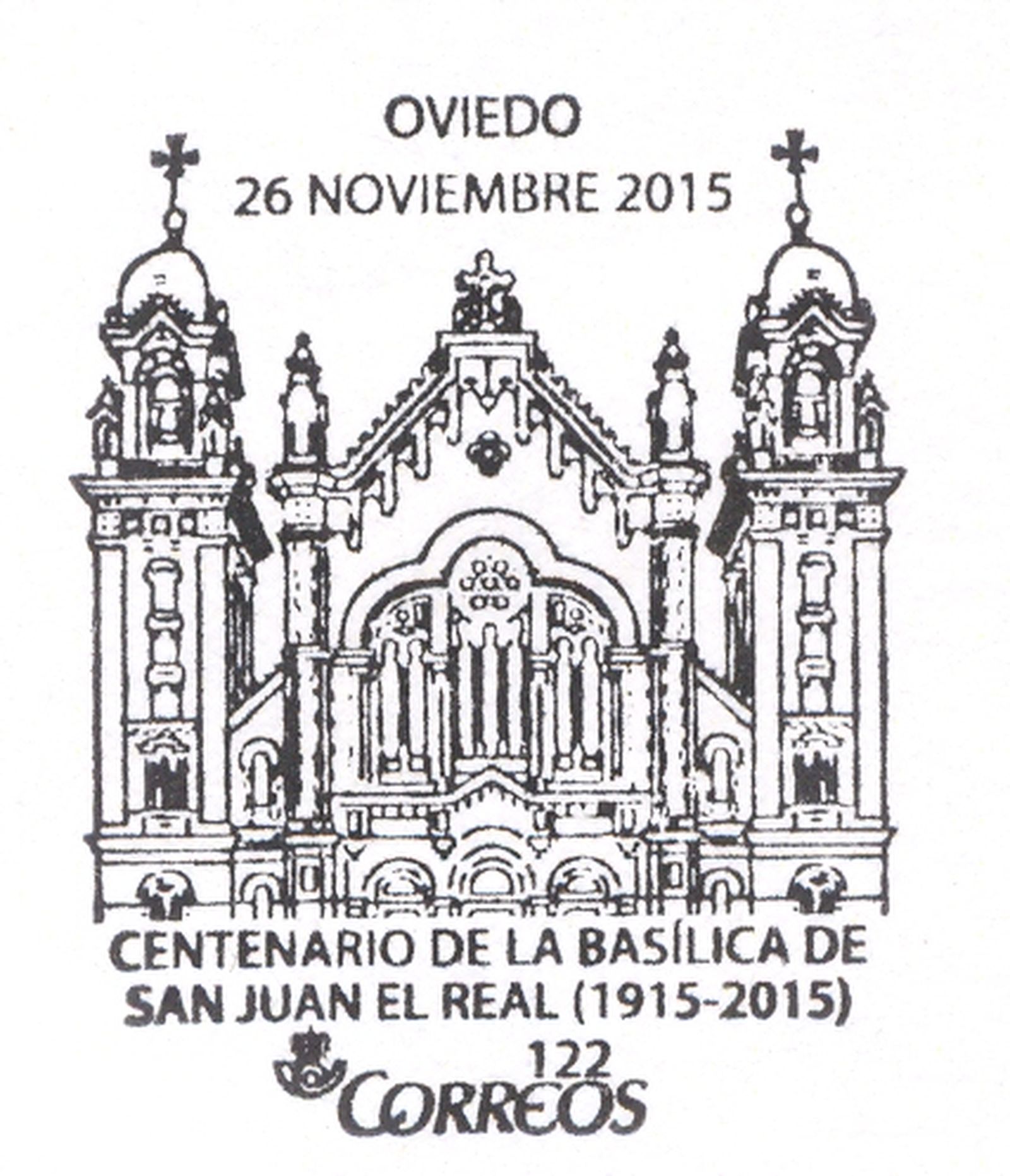 Reproduzco el sello personalizado que el Grupo Filatélico y NUmismático de Oviedo, con diseño de Maite Bravo Sánchez, emitió en noviembre del año 2015, con ocasión del Centenario de la Basílica de San Juan el Real de Oviedo 1915-2015.
