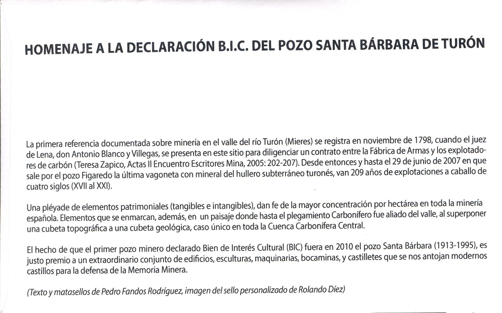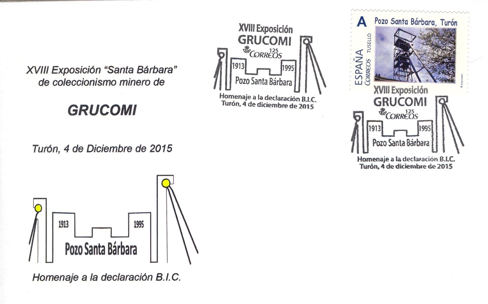 Reproduzco el sello personalizado que el Grupo Coleccionista Minero Investigador de Oviedo (GRUCOMI) emitió el pasado mes de diciembre del año 2015, con ocasión de la celebración, en Turón, de su "XVIII Exposición "Santa Bárbara" de Coleccionismo Minero" y como homenaje a la delcaración como Bien de Interés Cultural (B. I. C.) del "Pozo Santa Bárbara 1913-1995".