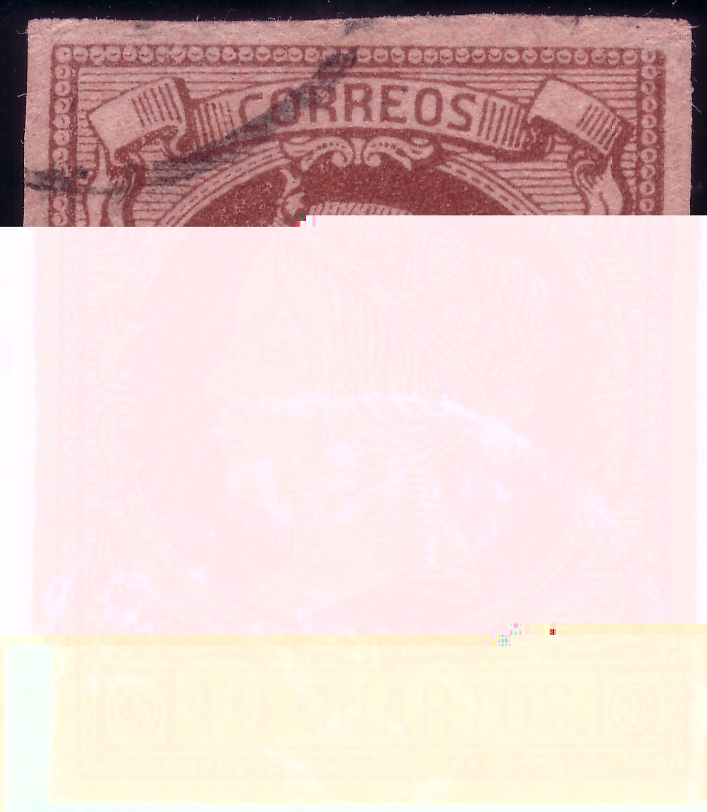 Siguiendo la discusion de los falsos postales del 2 reales de 1860, tengo dudas sobre el siguiente sello que os muestro. El grosor de muchas de las lineas, por ejemplo en lso adornos inferiores me llevo a pensar que podria ser un falso postal (comparado con la tipica finura de detalles de los sellos autenticos). Pero, una vez examinados los detalles, tampoco consigo cuadrarlo con ninguno de los tipos de falsos postales. Que os parece? Autentico muy empastado? :? :?