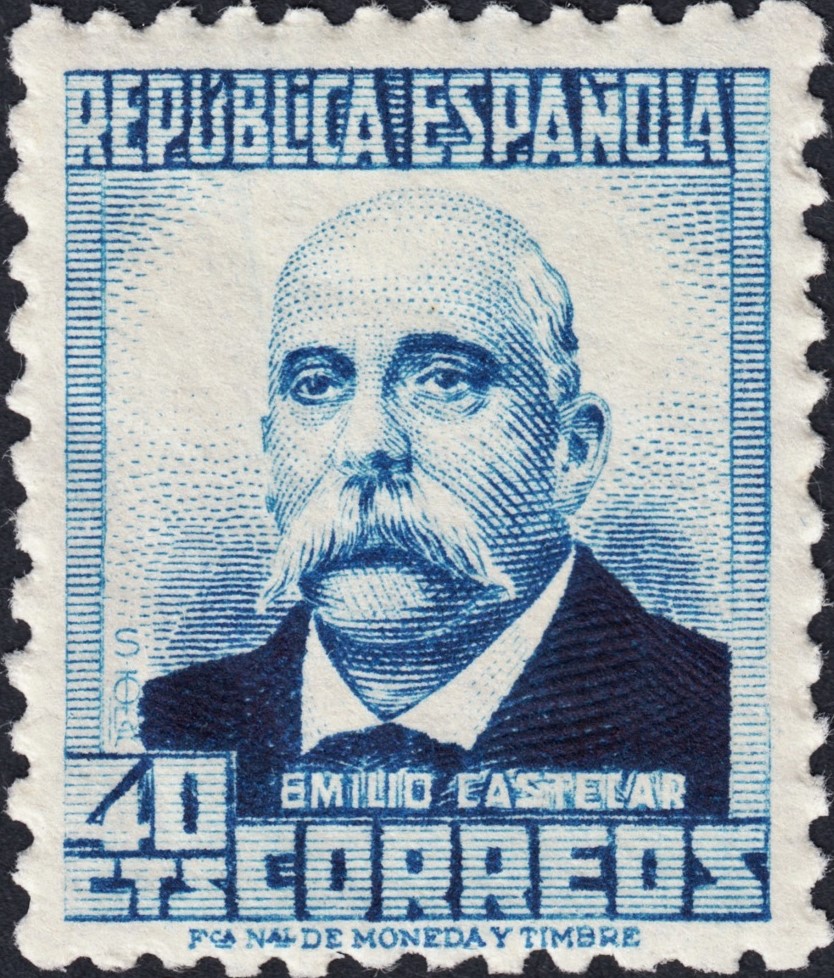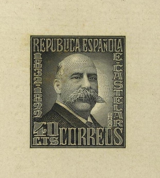 Presentamos en esta entrada el sello emitido de Emilio Castelar (1932) y un proyecto descartado, también de 1932 y ambos grabados, y quizá diseñados, por Sánchez Toda. Suponemos que se eligió el emitido en detrimento de, al menos, este otro sello del que mostramos una prueba de punzón, en el caso, repetimos ahora explícitamente, de que no hubiese más proyectos. Pero siempre partimos, hemos de insistir, de la hipótesis de que ambos sellos compitieron por ser emitidos, y no tenemos en cuenta la posibilidad de que el no adoptado fuese, en realidad, un proyecto descartado para otra emisión posterior. Si alguien dispone de datos ciertos y seguros, serán muy bienvenidos.