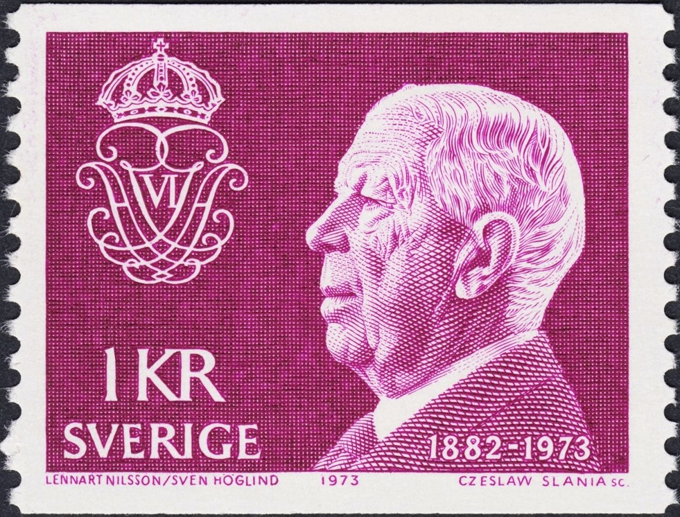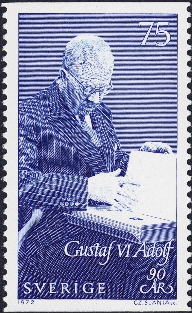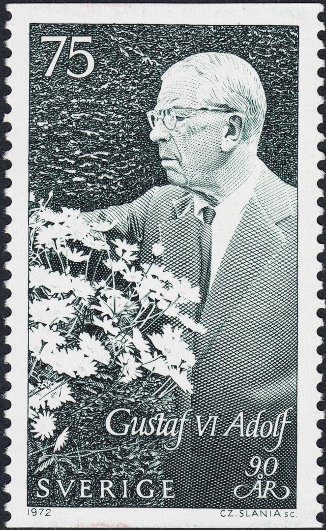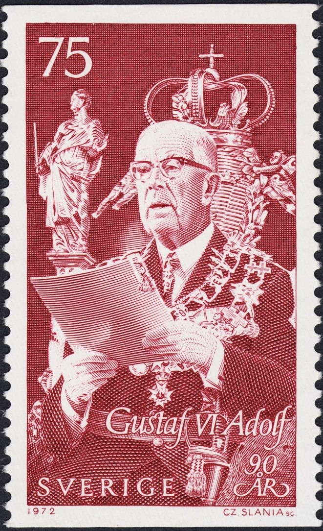 Al rey Gustavo VI Adolfo de Suecia, lo grabó Slania al poco de establecerse en ese país nórdico en el que tanto habría de fructificar su talento inanto. Fue en la emisión básica de 1961, a partir del mismo diseño que antes había grabado Sven Ewert.