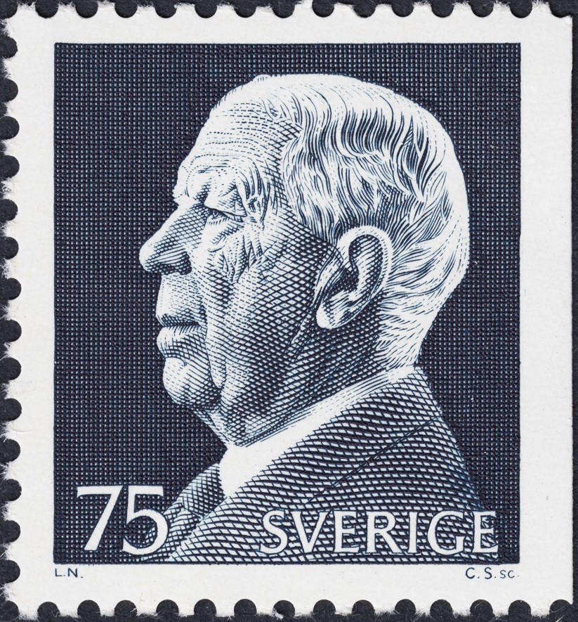 Pero sin duda los mejores sellos del antecesor de Carlos XVI Gustavo que grabó Czeslaw Slania, fueron los emitidos a principios de los años setenta, con el viejo rey ya nonagenario y a punto de ceder su corona al nieto. Exponemos en esta entrada los dos valores emitidos a finales de 1973, con ocasión de la muerte reciente del rey, y también uno de los dos valores emitidos tan sólo unos meses antes. De aquéllos se dice que son dos grabados diferentes y que Slania los talló en sólo diez días. De ninguna de ambas consideraciones dudamos, por supuesto, conocidas, por ende y de sobra, su genialidad y su presteza, ambas ya entonces, y aún más hoy, legendarias.