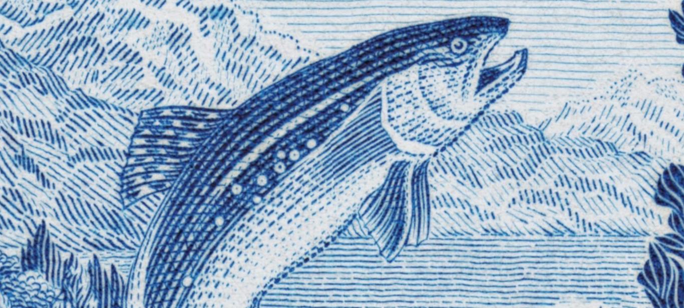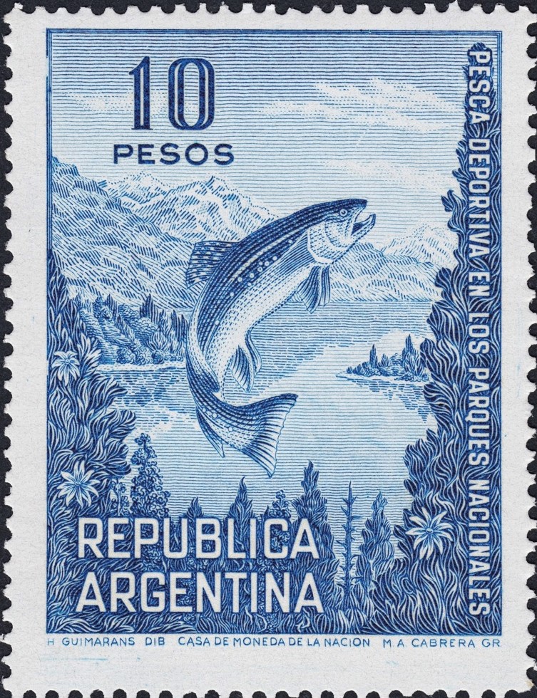 Sello emitido por Argentina en 1968 sobre la pesca deportiva, y que Cabrera, a partir de un dibujo muy inspirado y lúcido de H. Guimarans, graba con la mesura y sutileza habituales. Espléndido.