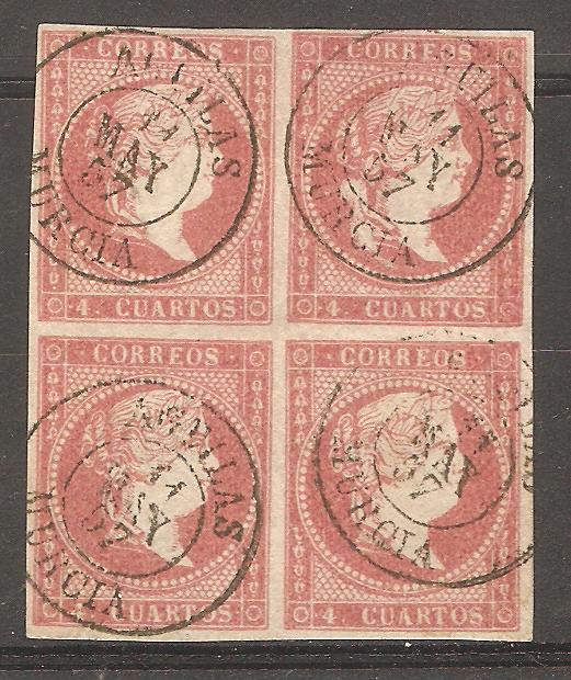 Dificil es de discernir su autenticidad sin tener la pieza en las manos y en ocasiones ni así puede darse una opinión fiable. Pero en cualquier caso ya ese franqueo dá que pensar y hay que desconfiar pero con ese fechador de Aguilas mi desconfianza aumenta exponencialmente y lo justifica el bloque del 4 ctos rojo con ese fechador......falso, O.K.