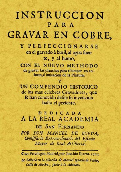 INSTRUCCIONES PARA GRAVAR EN COBRE Y PERFECCIONARSE EN EL GRABADO A BURIL, AL AGUA FUERTE Y AL HUMO, Manuel de Rueda, 1761. (Completado).