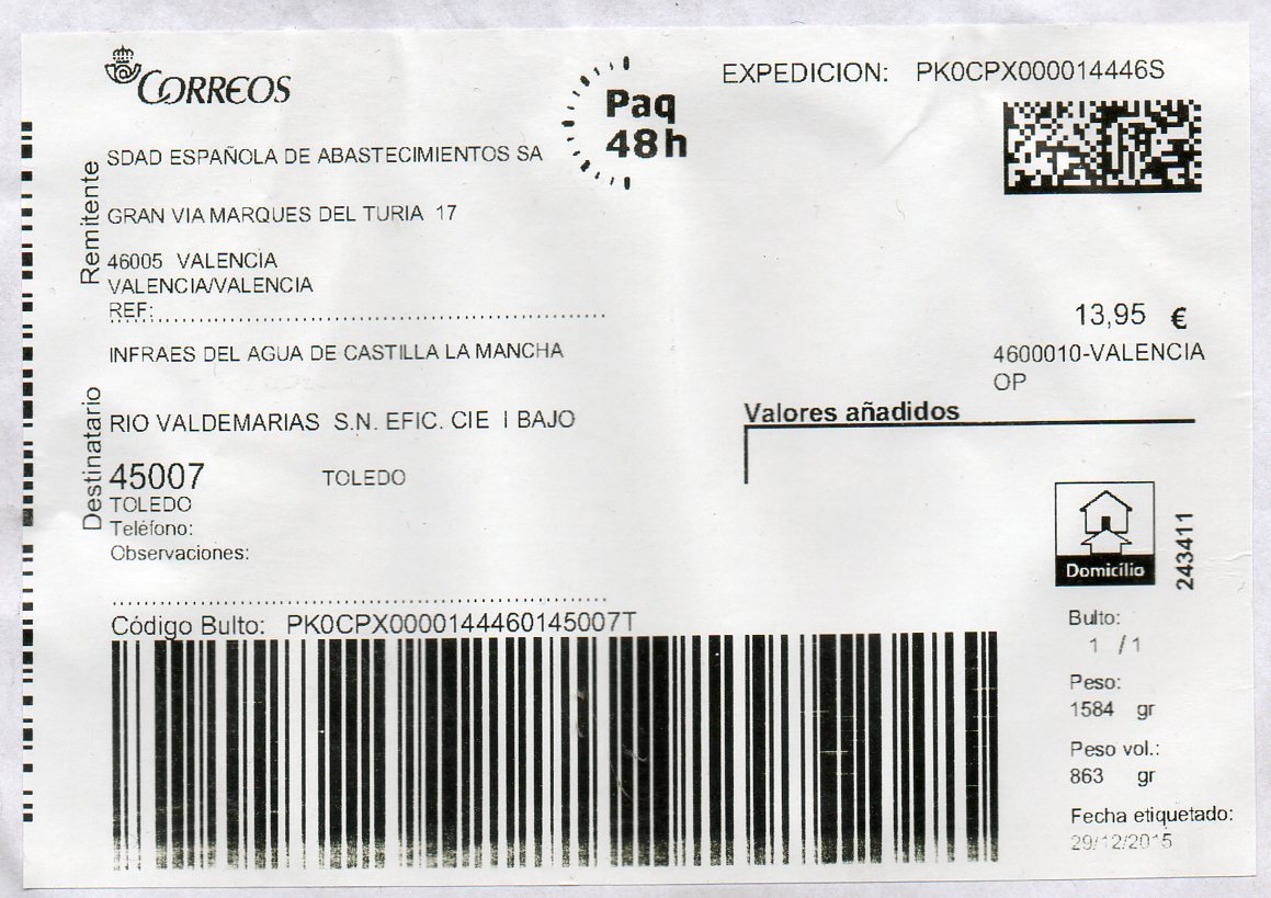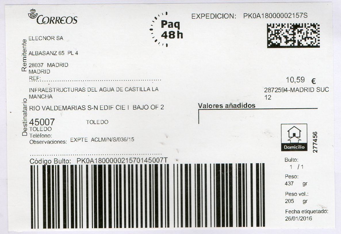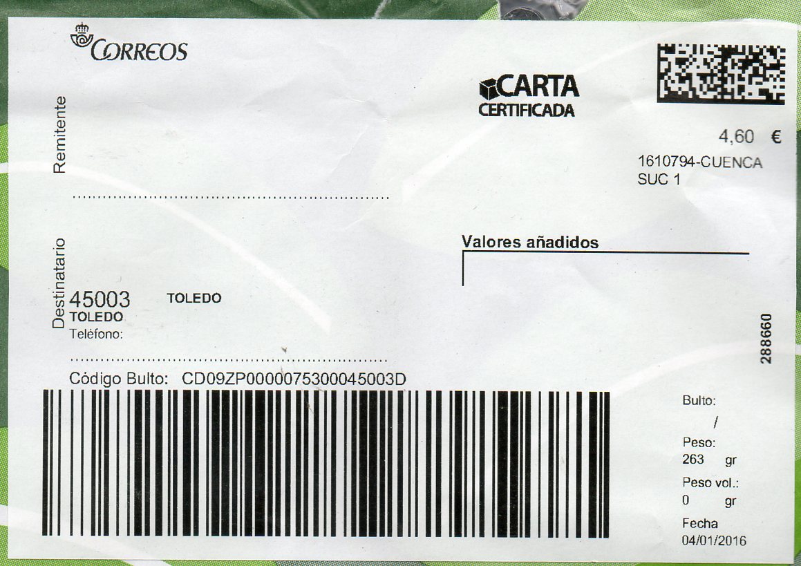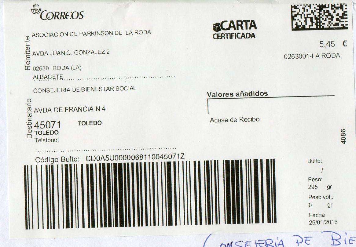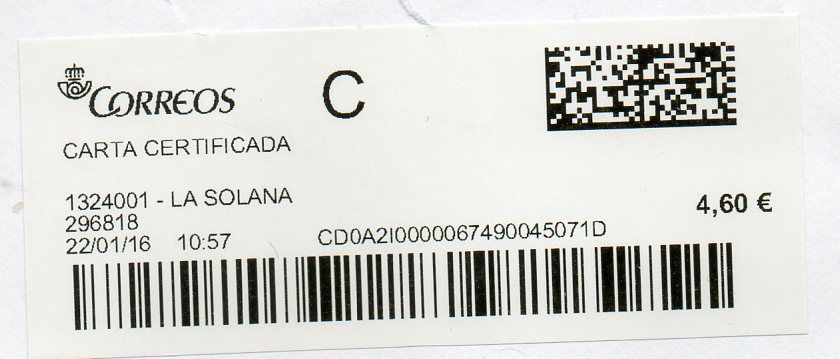 0263001-LA RODA / CARTA CERTIFICADA / 26/01/16. Una etiqueta grande.