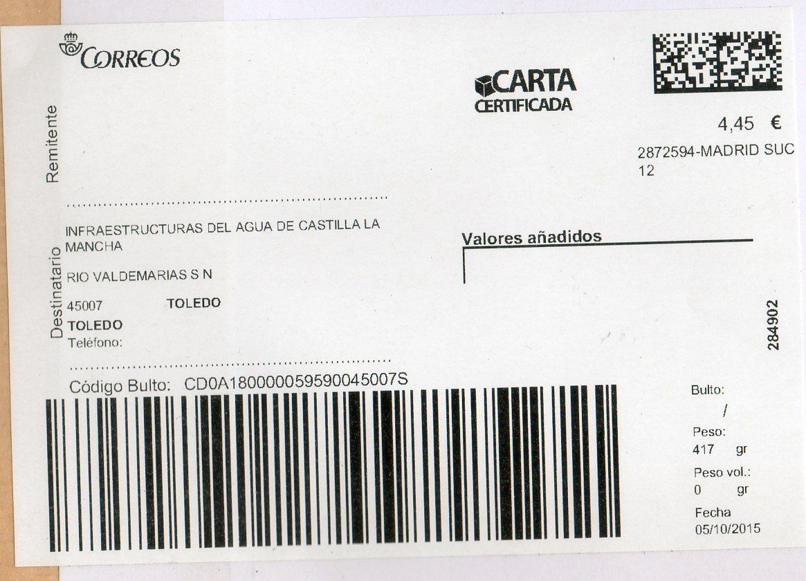 CARTA URGENTE CERTIFICADA / 4520594-TALAVERA DE LA REINA SUC 1 / 25/01/16