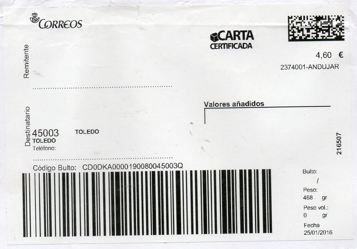Una etiqueta grande de ANDUJAR-2374001 / CARTA CERTIFICADA / 25/01/16