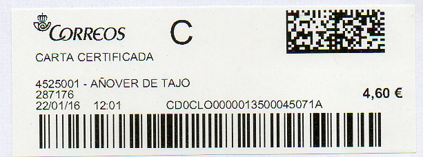 4525001-AÑOVER DEL TAJO / CARTA CERTIFICADA / 22/01/16.