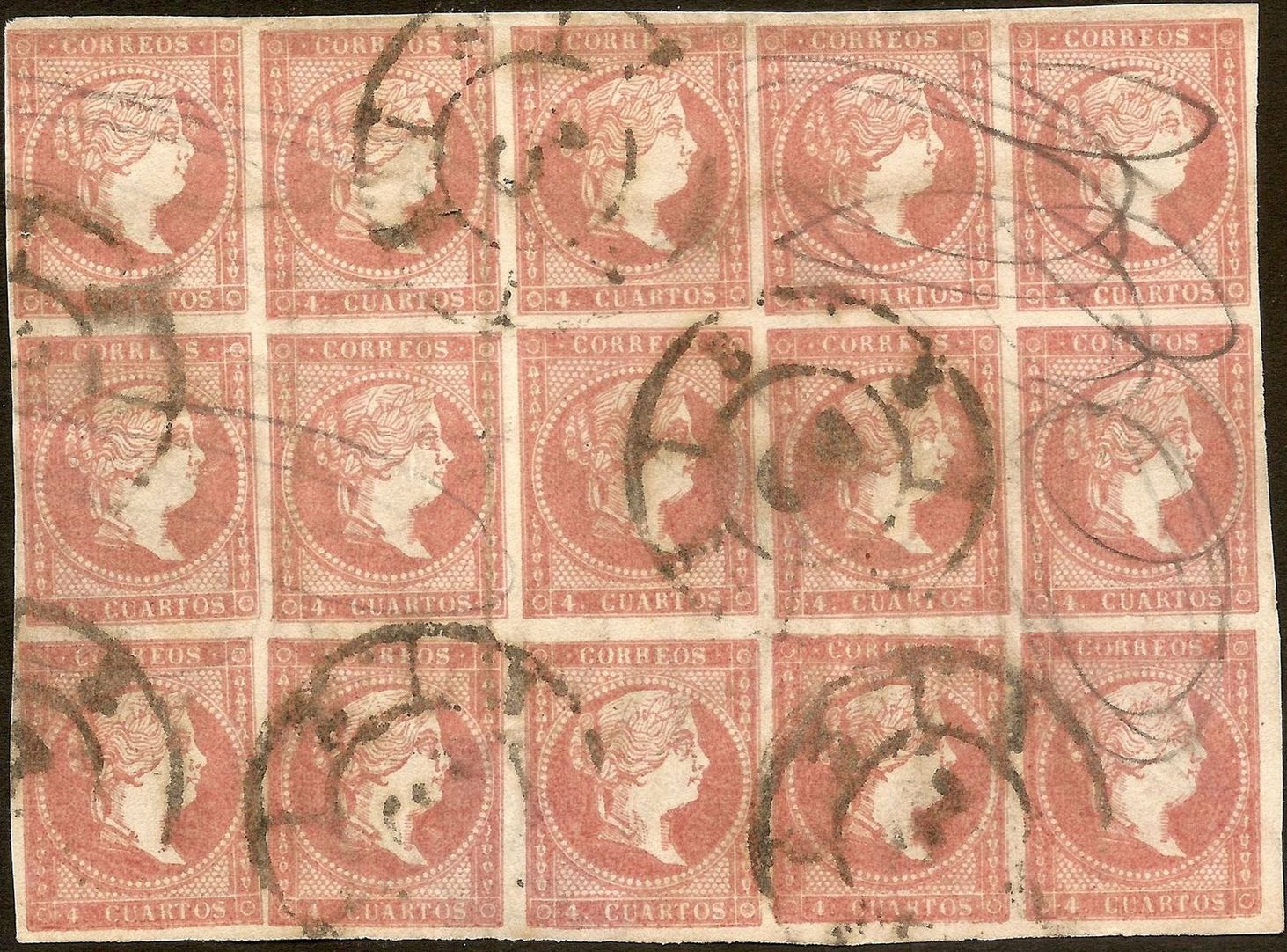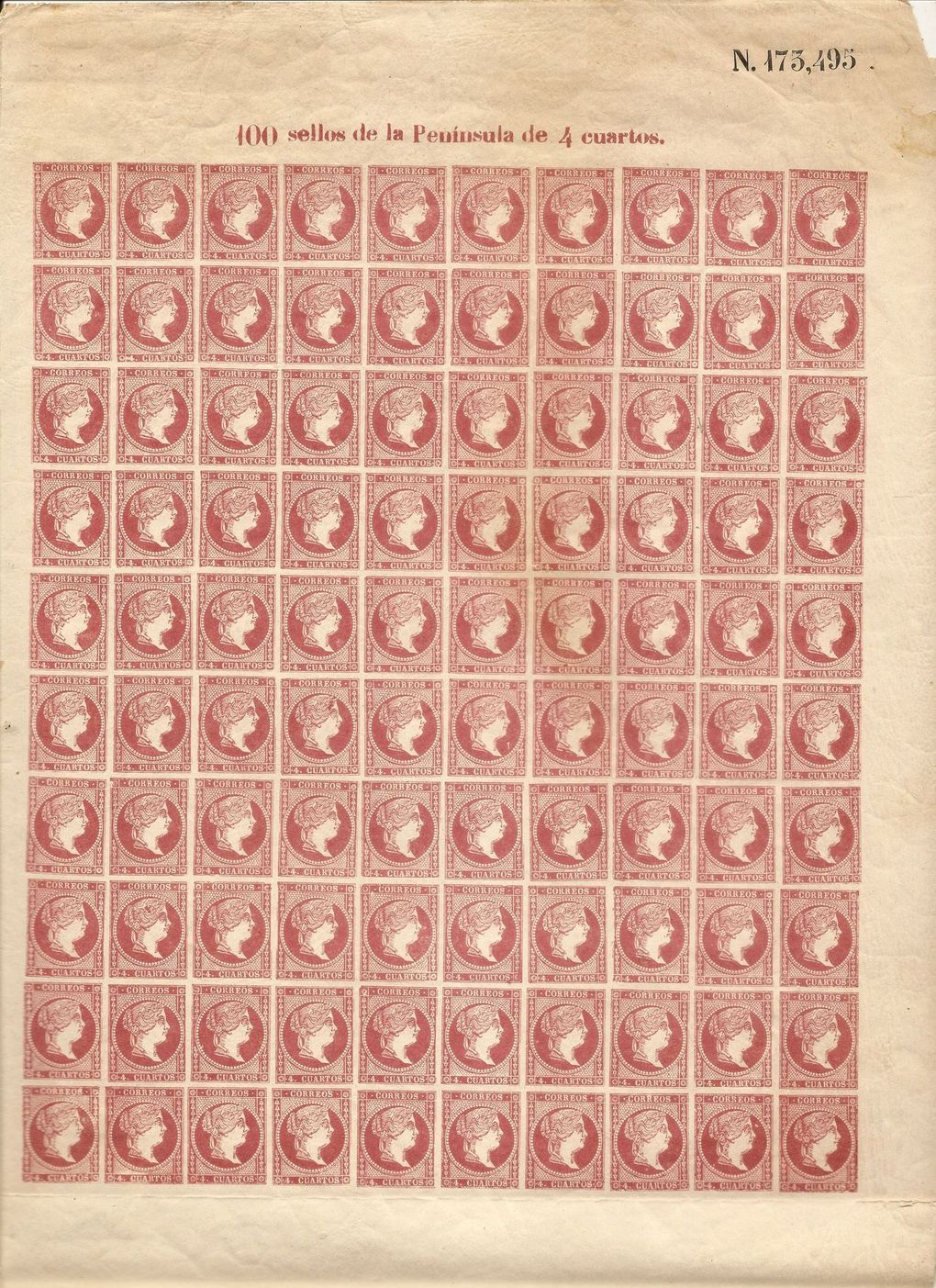Yo tengo una tira de 4 con esta composicion aunque de una tirada tardia, con los clises mucho mas desgastados. Probablemente fuera impresa poco antes de lavar los clises para montar el tipo IV/V. En el caso de la tira que tengo, el sello de tipo I esta en la fila inferior, borde de hoja. El tuyo tambien es asi?