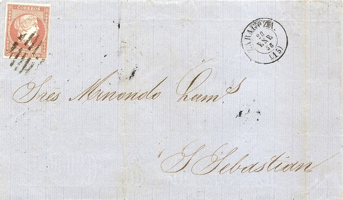 Esta carta, con un tipo I anulado a pluma, desconozco por que en esos años y en esta serie SS anulaba a pluma de vez en cuando, recuerdo otra de primeros de 1857 con una especie de 4R a pluma sobre este sello también,